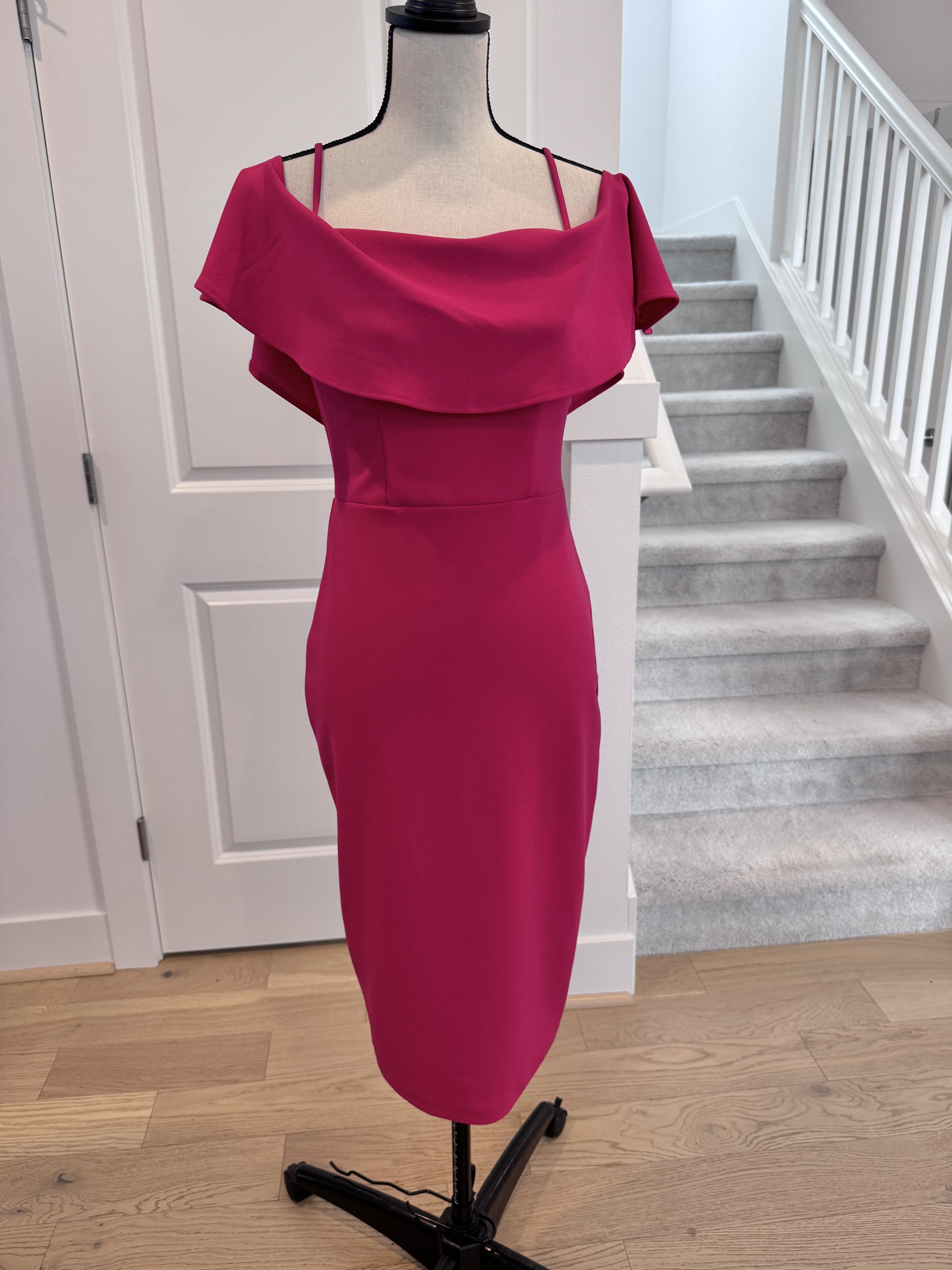 Vibrant fuchsia cocktail pencil dress featuring a flattering off-shoulder design with draped neckline and a sleek, form-fitting silhouette. Perfect for Interview! Chest 36-38 Waist 26-28 Hips 36-39 Length 34-40 adjustable straps