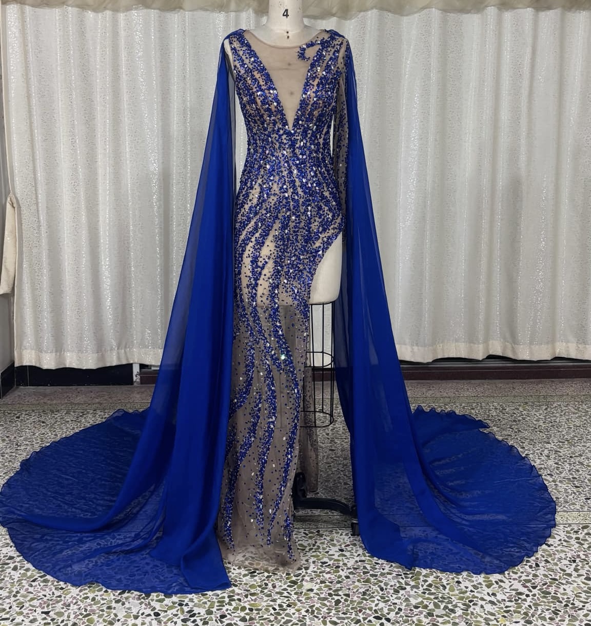 This striking blue gown features intricate all rhinestone beadwork,removable sheer panels offering a show-stopping look. The deep V-neck and fitted silhouette highlight sophisticated glamour. Along with thigh high slit