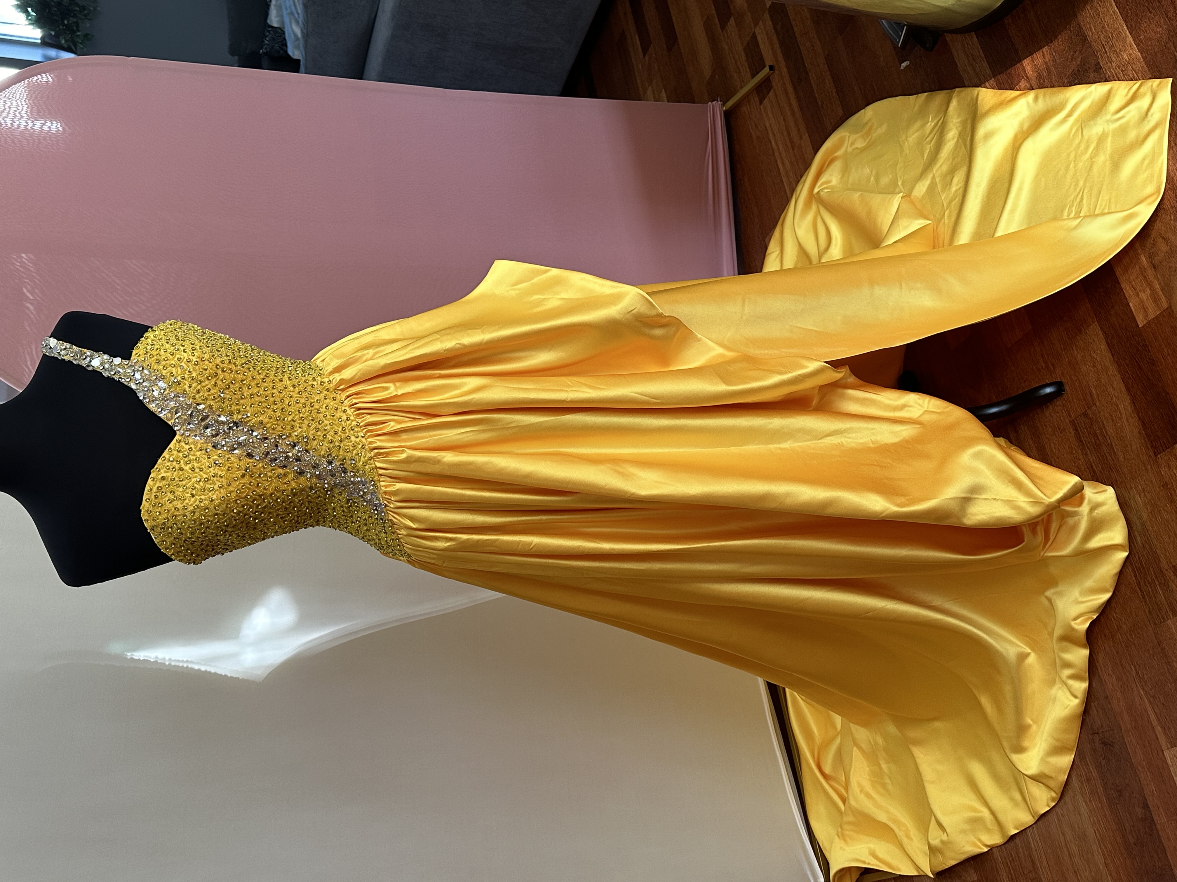 Yellow Satin Evening Gown with rhinestone Embellishments