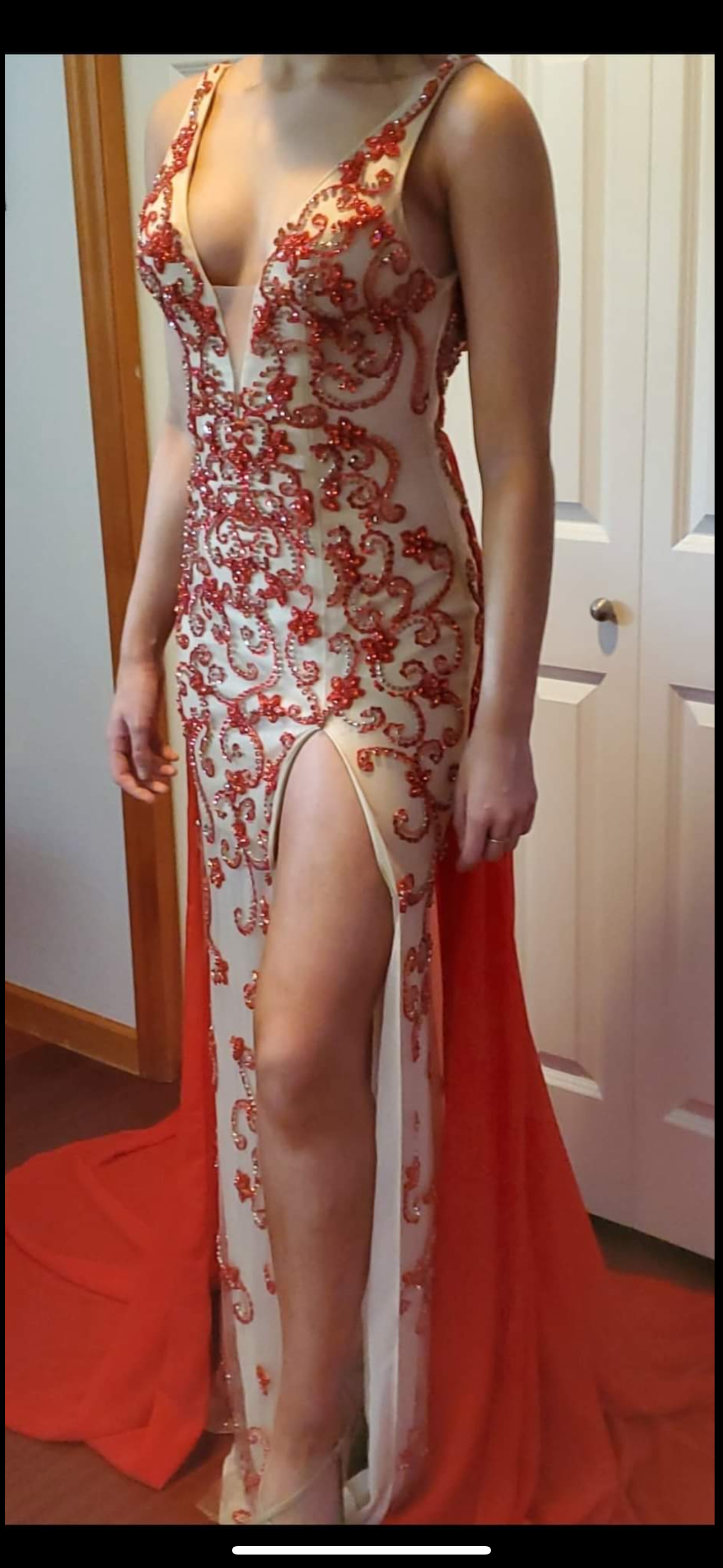 Stunning red and ivory gown featuring intricate rhinestone detailing and a daring thigh-high slit. Features a red chiffon overskirtPerfect for making a statement!