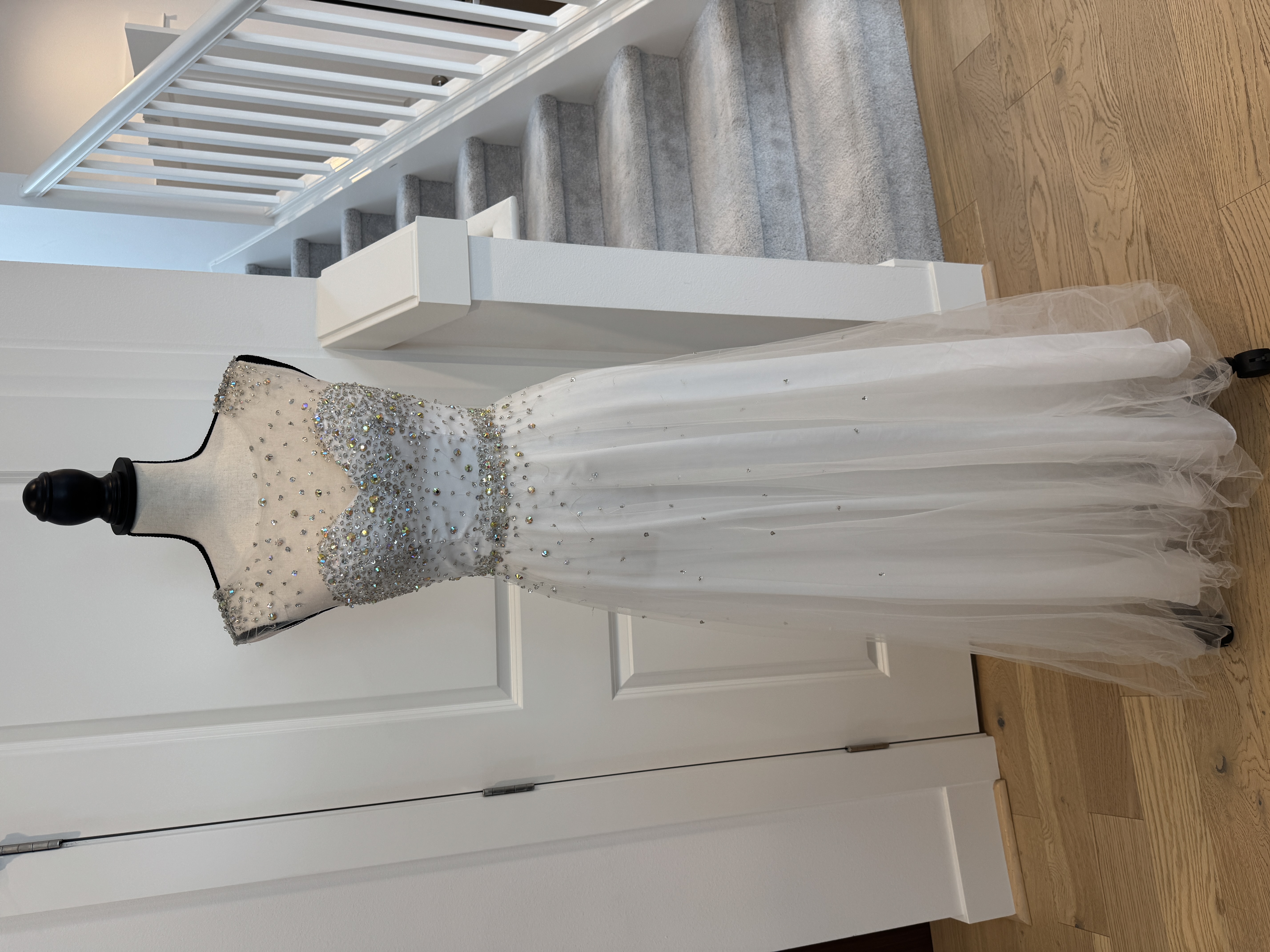 Floor-length gown featuring a rhinestoned bodice and a soft tulle skirt, adorned with delicate scattered gems throughout for a twinkling effect. Zips up the back. Perfect for preteen or teen! 59” long, shoulder to hem
