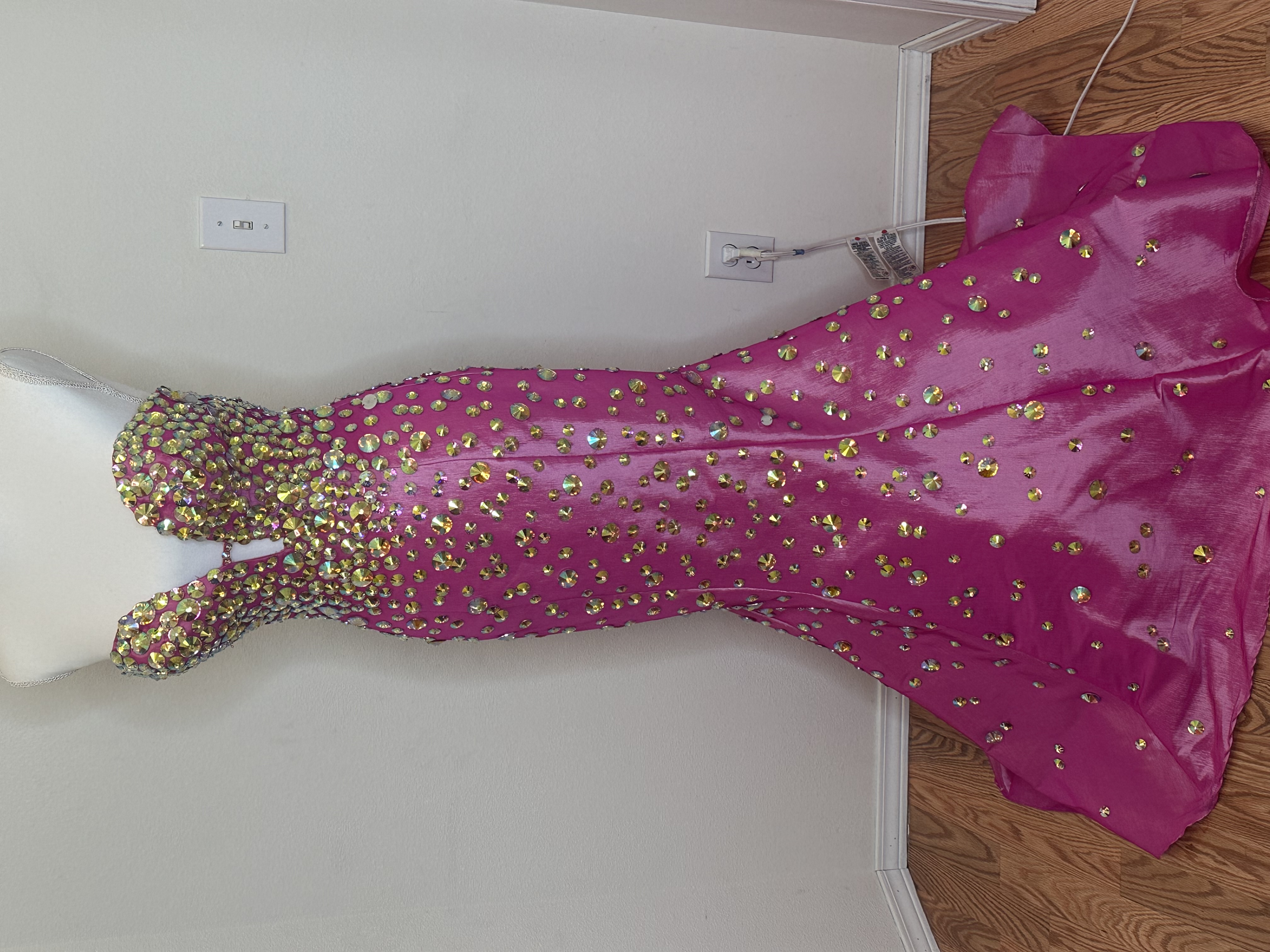 Vibrant pink gown adorned with large rhinestone accents, featuring a fitted bodice and a mermaid flared bottem Perfect for standing out in any formal event.