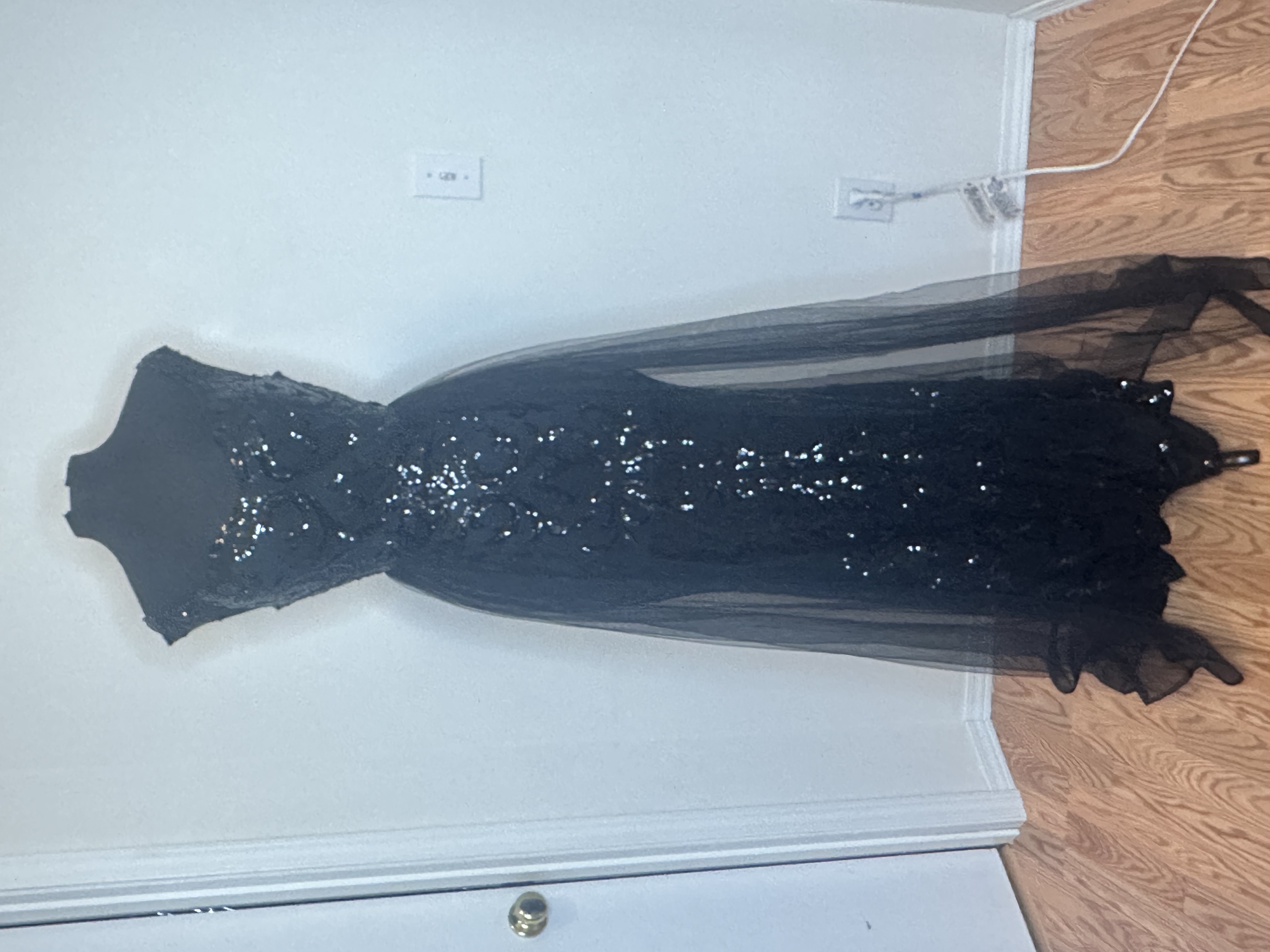 This floor-length tulle dress features sparkling sequin detailing, and tulle overskirt creating a stunning silhouette. Perfect for someone looking to add a touch of glamour to their wardrobe.
