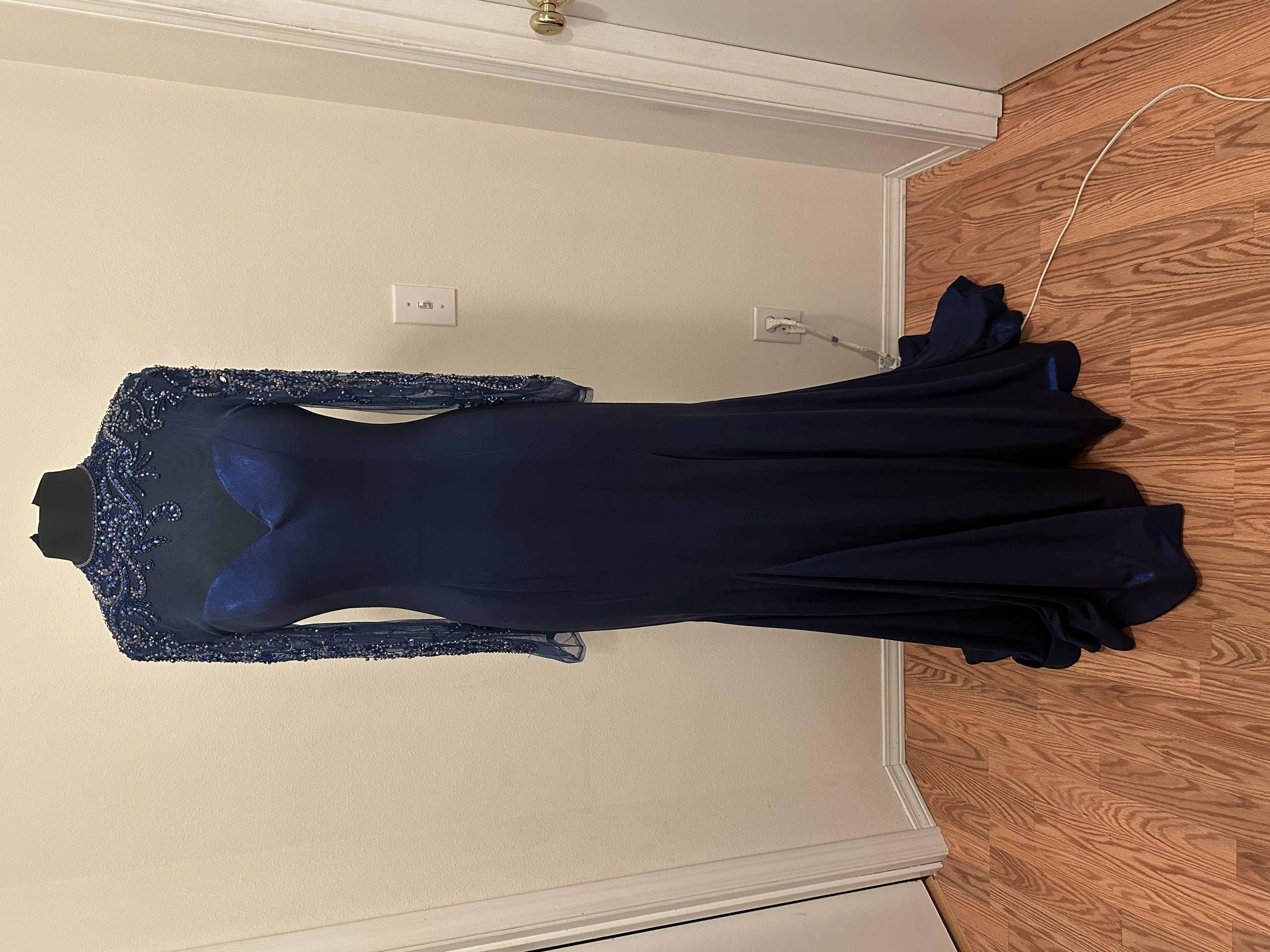 This navy blue evening gown features delicate lace detailing with rhinestone embellishments over the long sleeves and neckline, adding a unique touch. Flared hemline features a horsehair hem.