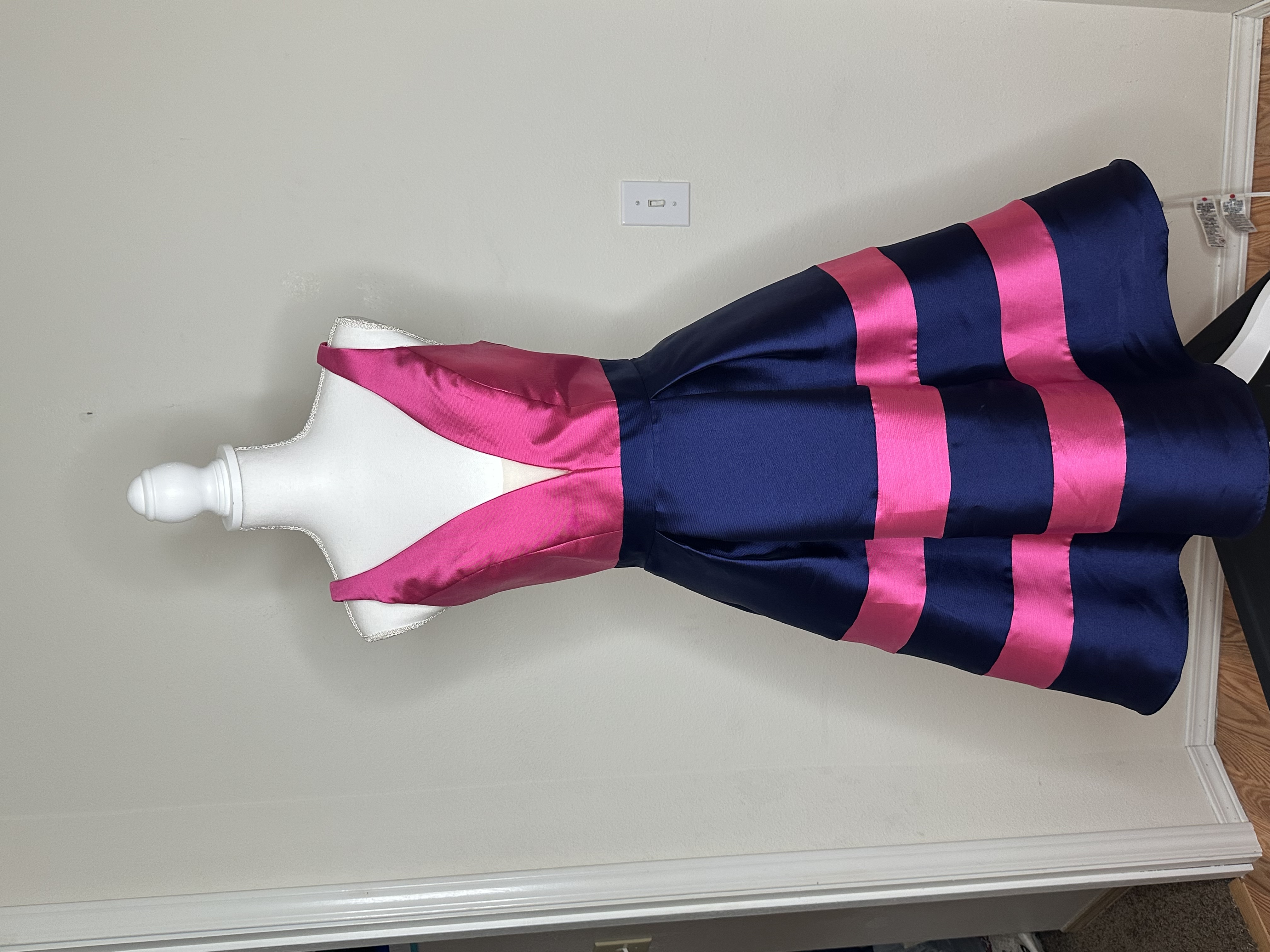 McDuggle Chic navy and vibrant pink striped dress with a flattering V-neck and voluminous skirt. Perfect for making a stylish statement.