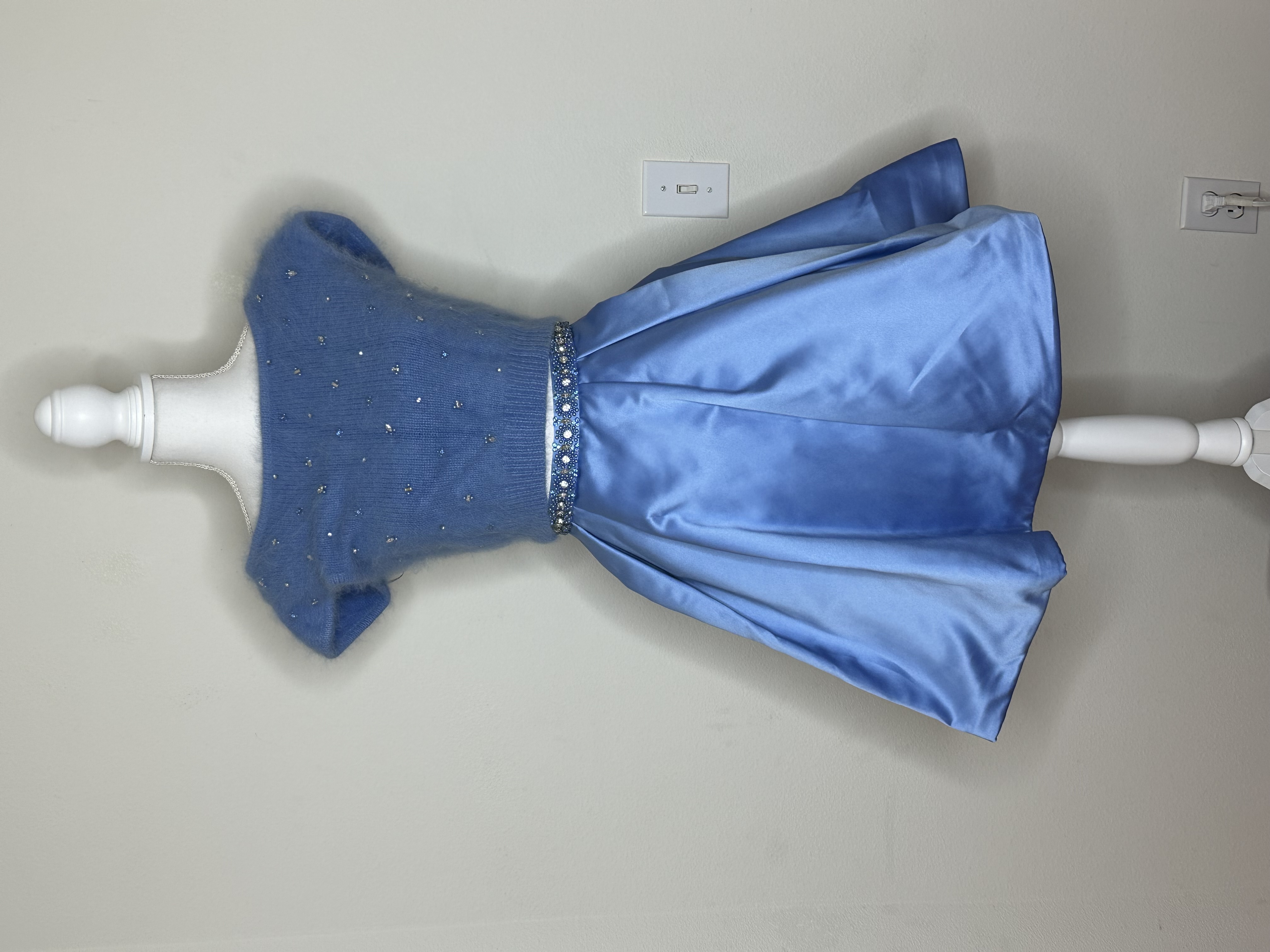 This striking periwinkleblue dress features an Angora sweater with rhinestone accents on the top and a smooth satin skirt. Perfect for adding a pop of color and sparkle to any wardrobe.