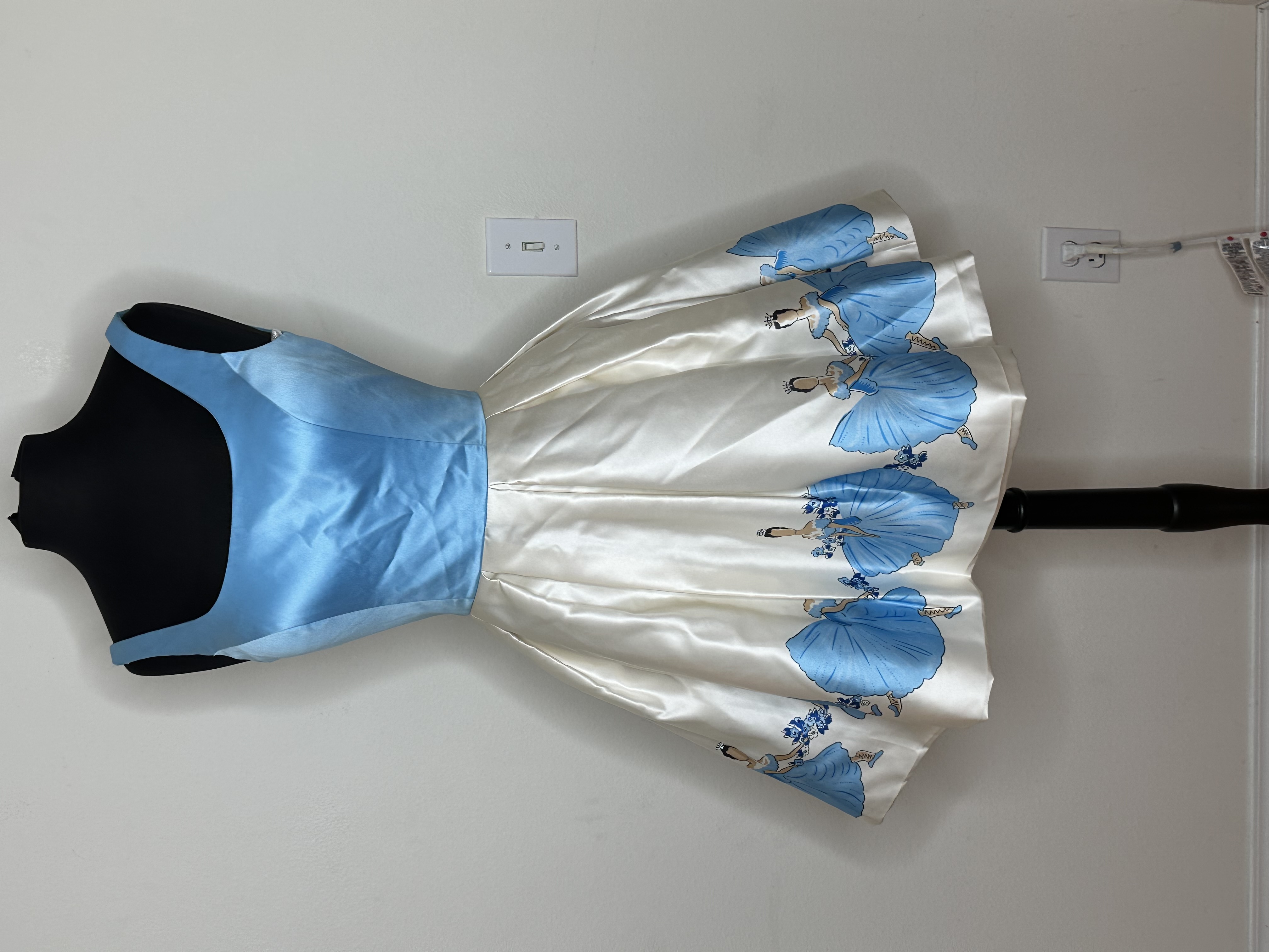 This eye-catching dress features a vibrant blue bodice with a satin-like ivory skirt adorned with graceful ballerina prints. Perfect for adding a playful touch to any wardrobe.