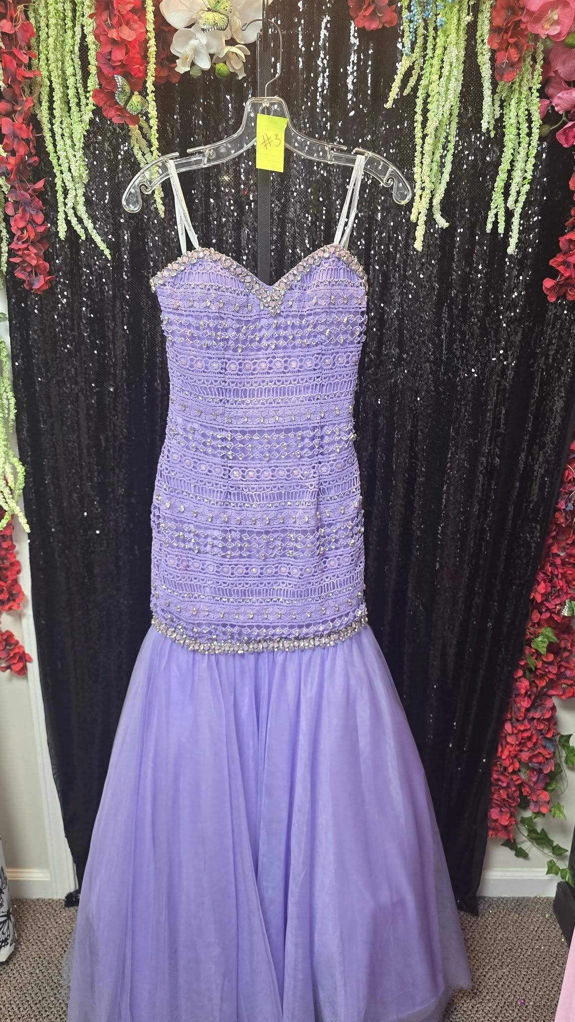 Glamorous lavender dress, adorned with intricate beading and sequins on the bodice, flowing into a softer tulle skirt.