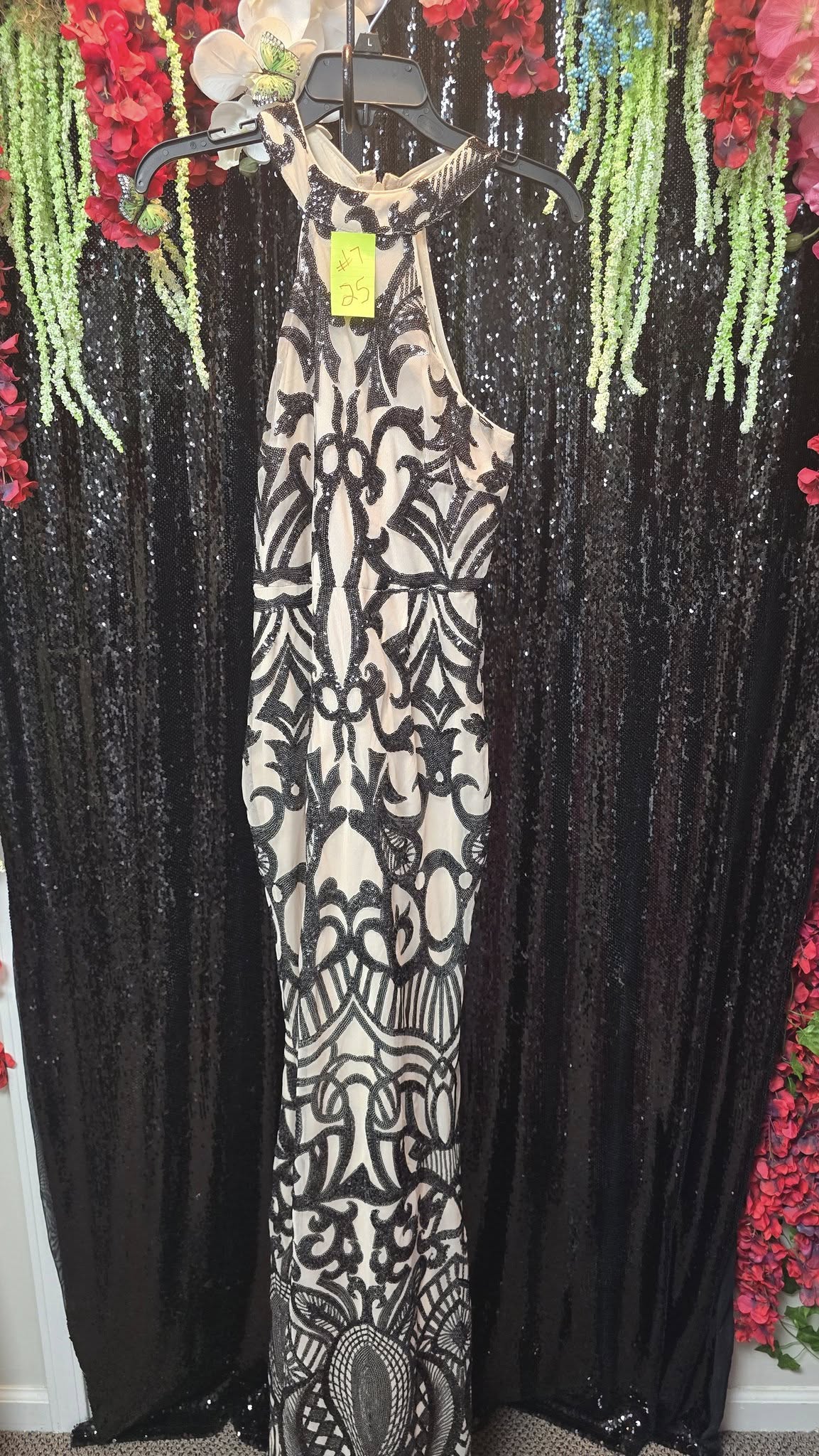 Intricate black embroidery adorns this tasteful nude evening gown, creating a striking contrast. Perfect for turning heads with its detailed pattern and sleeveless design. New Ricarica sz 4-6