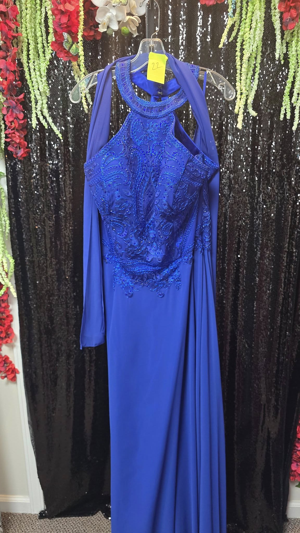 Stunning blue floor-length dress with intricate beadwork and embellishments around the neck and bodice. Perfectly tailored with long sleeves and a dynamic silhouette. New Nox sz 20