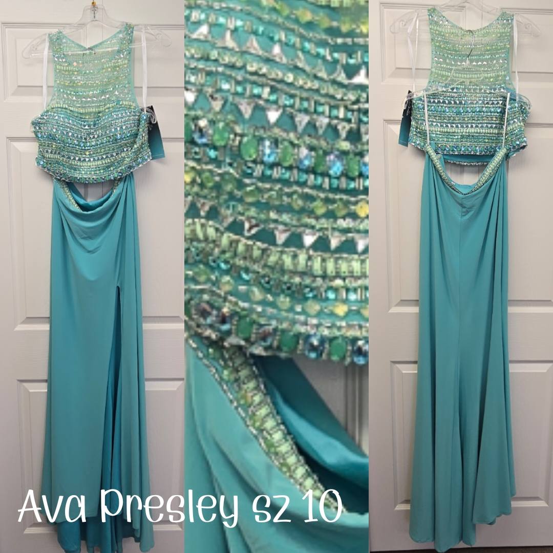 Striking size 10 aqua gown adorned with intricate beaded layers that shimmer, coupled with a sleek flowing skirt with a high slit for dramatic flair. Ava Presley sz 10