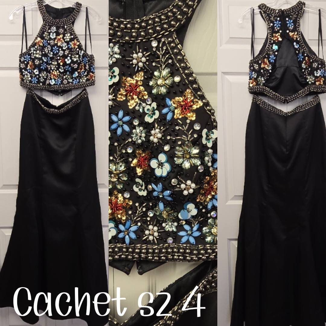 Striking evening gown featuring a floral embellished top with intricate beadwork and a smooth black skirt. Ideal for someone looking to make a statement. Cachet sz 4