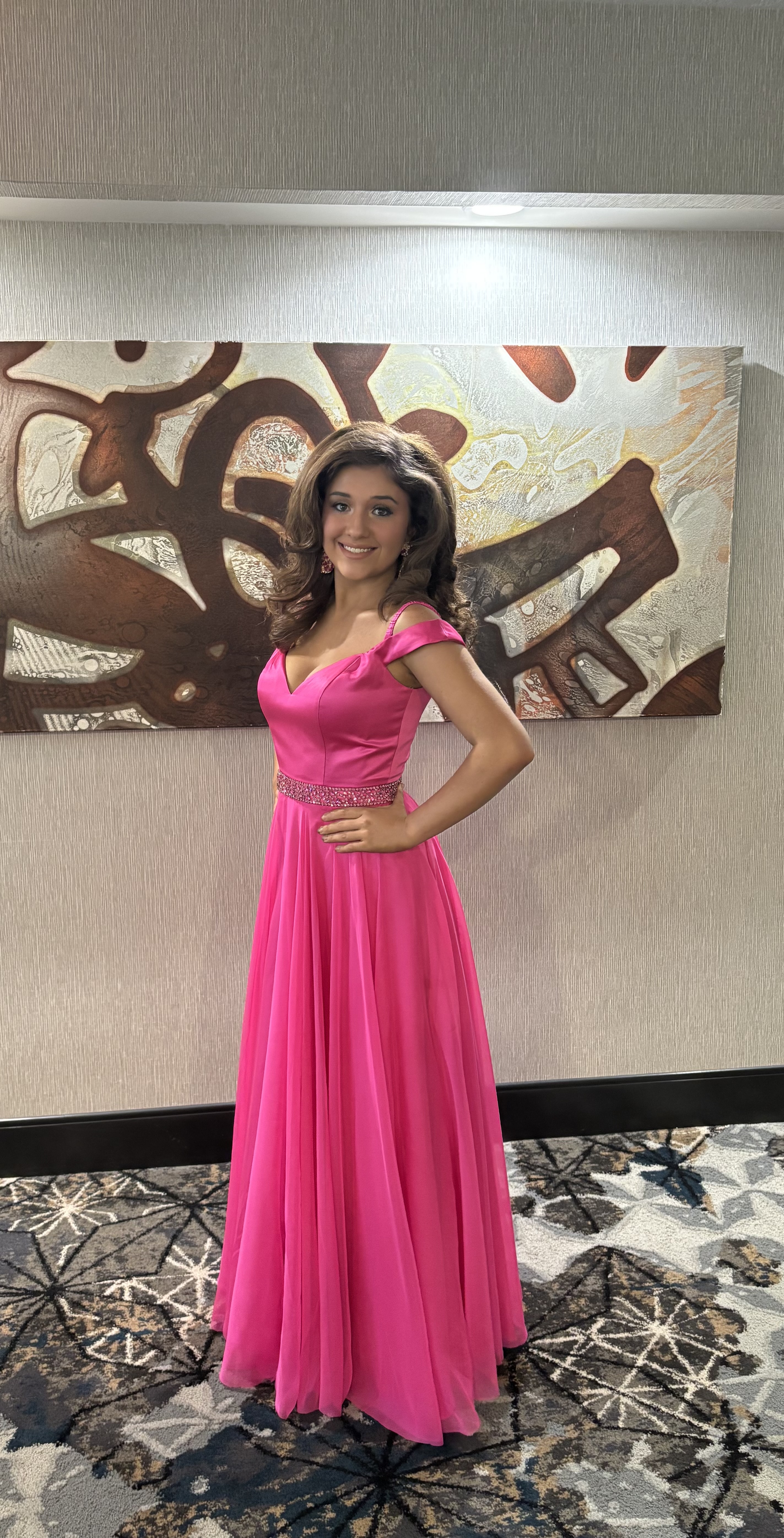 Vibrant pink gown with a sleek bodice and shimmering waist belt. The flowing A-line skirt adds a whimsical touch to the structured top.