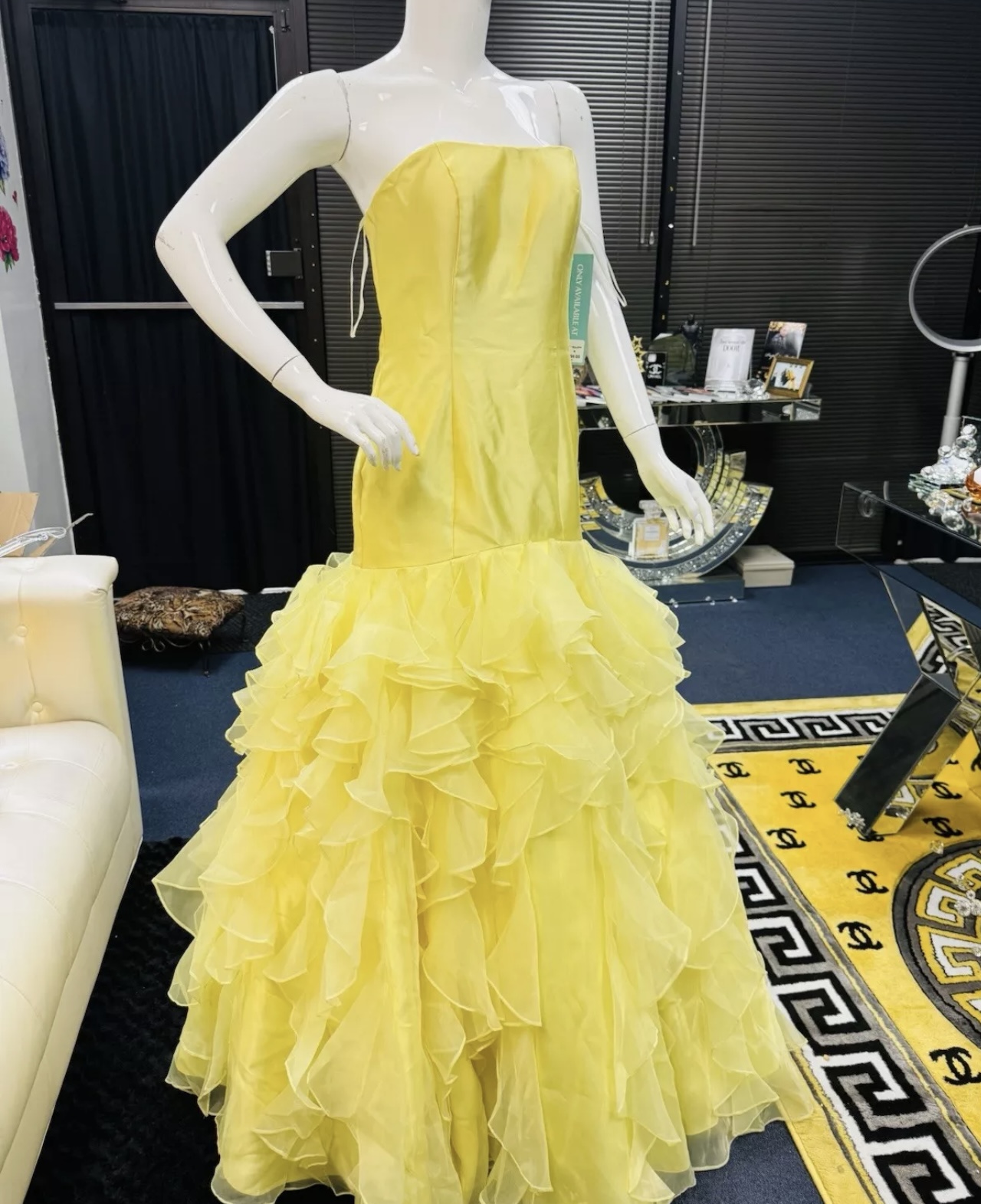 This distinct tiered gown in a vivid yellow shade features a strapless design and voluminous ruffle detailing, making it a standout piece.