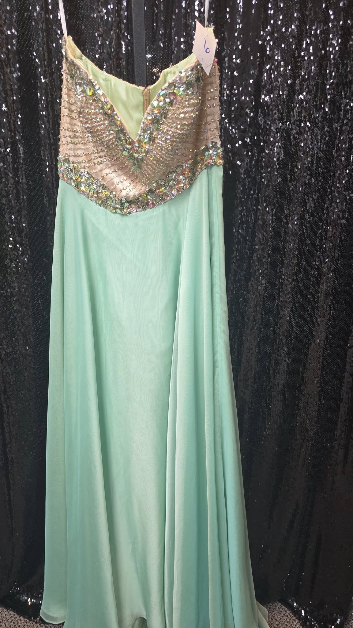 This striking gown features a mint green skirt paired with a heavily embellished bodice. Ideal for standing out in any occasion.