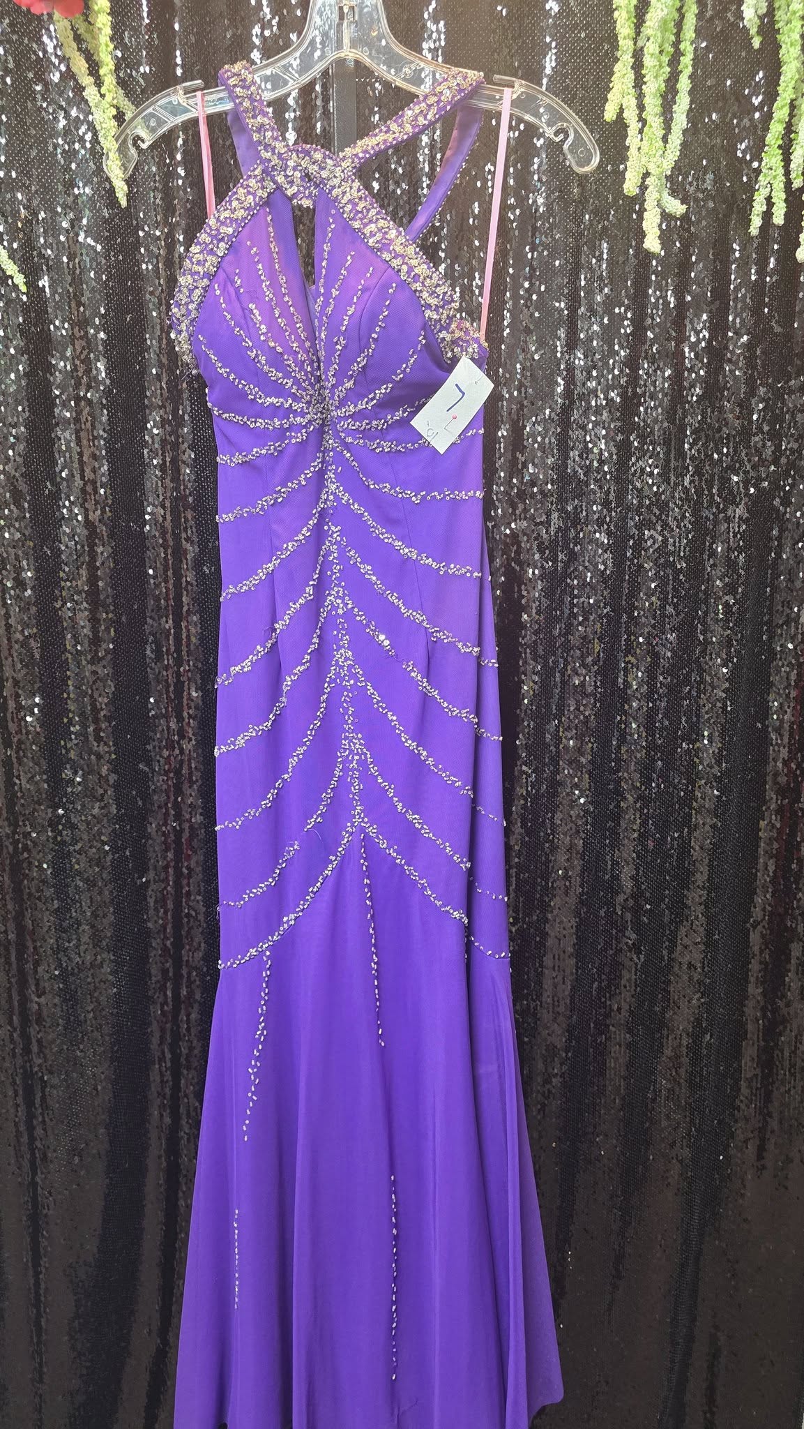 Vibrant purple gown adorned with intricate beaded details, perfect for adding a splash of color and sparkle to any wardrobe. Features a flattering design with a flowing silhouette.