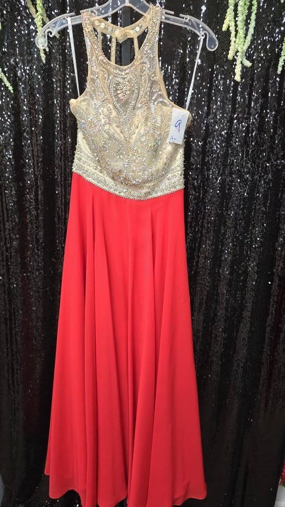 This striking gown features a gold embellished bodice with intricate beadwork, paired with a vibrant red flowy skirt. Ideal for making a standout appearance.