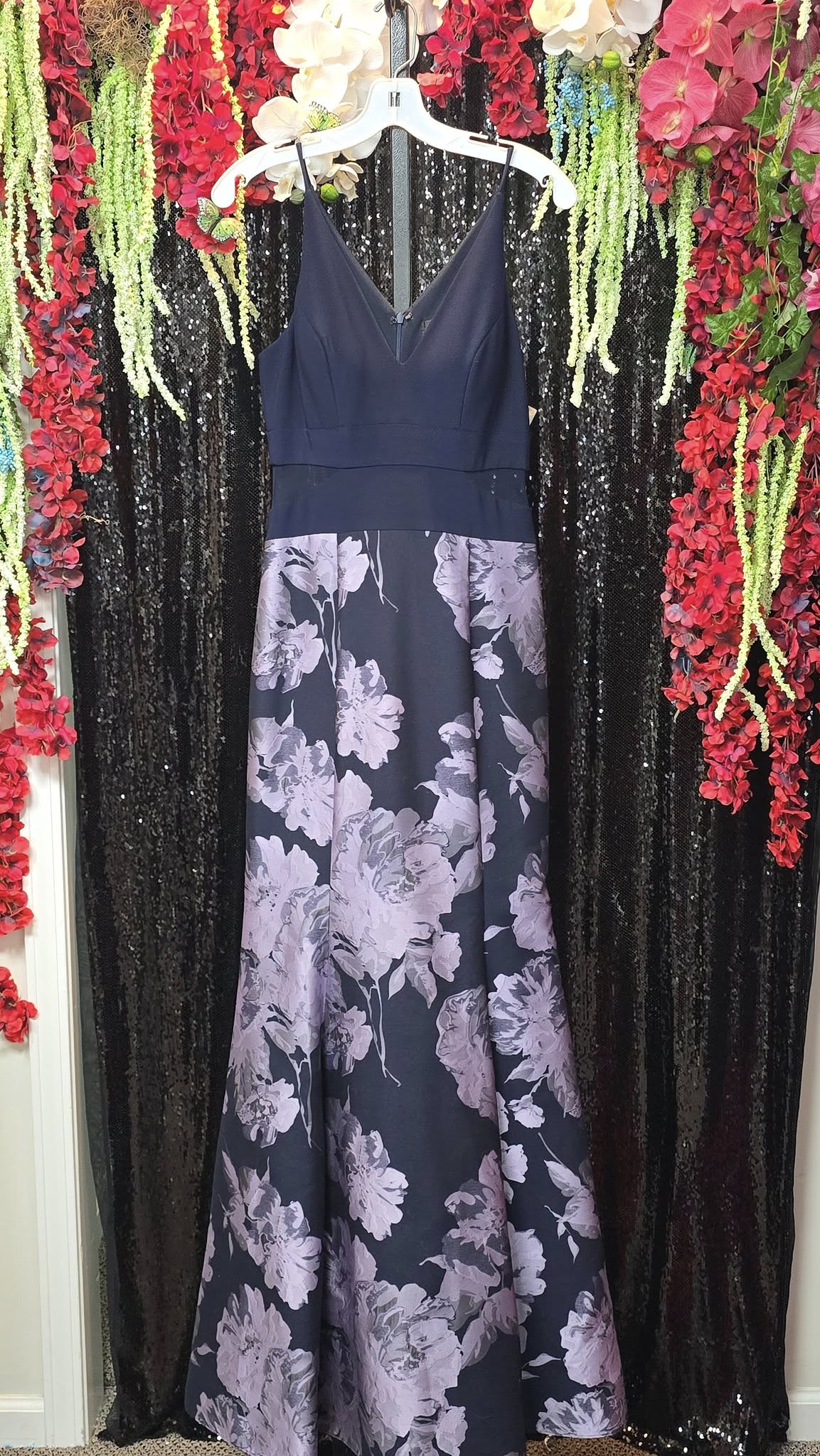 Stunning floor-length navy gown with a vibrant floral print skirt. Perfectly tailored to flaunt a charming silhouette.