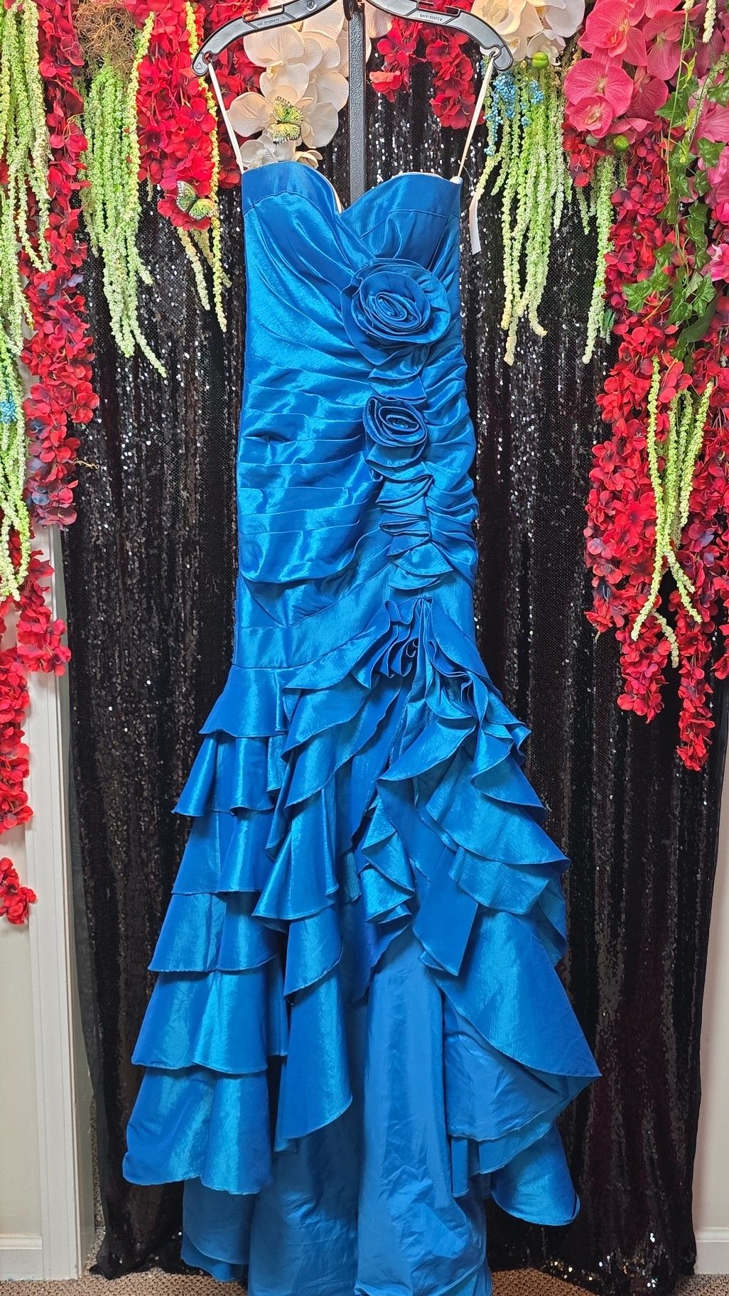 Gorgeous layered evening gown in a stunning shade of blue, featuring flower embellishments and a ruffled tiered skirt. Perfect for making a striking impression.