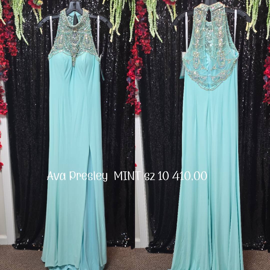 Stunning mint evening gown featuring a heavily embellished bodice with intricate beadwork and a sleek flowing skirt. Perfect for those who love a touch of sparkle and a graceful silhouette.