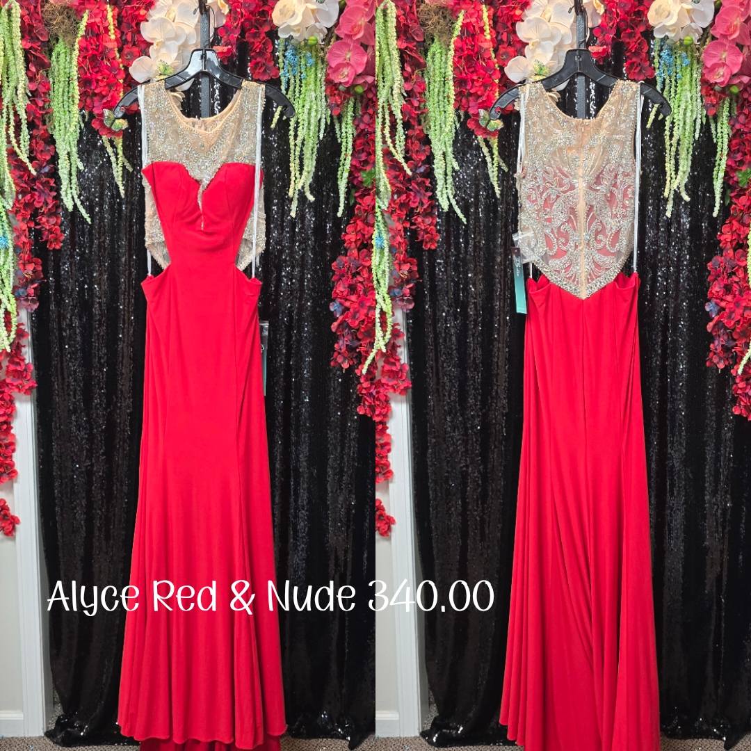 Striking long red gown featuring a detailed nude and gold bodice. Ideal for making a bold statement at any upscale event.