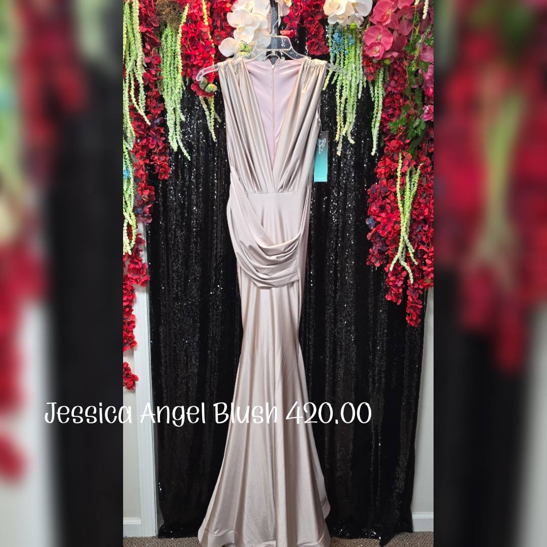 Chic blush-hued gown featuring a draped design with a sleek silhouette. Perfect for making a statement at any upscale occasion.