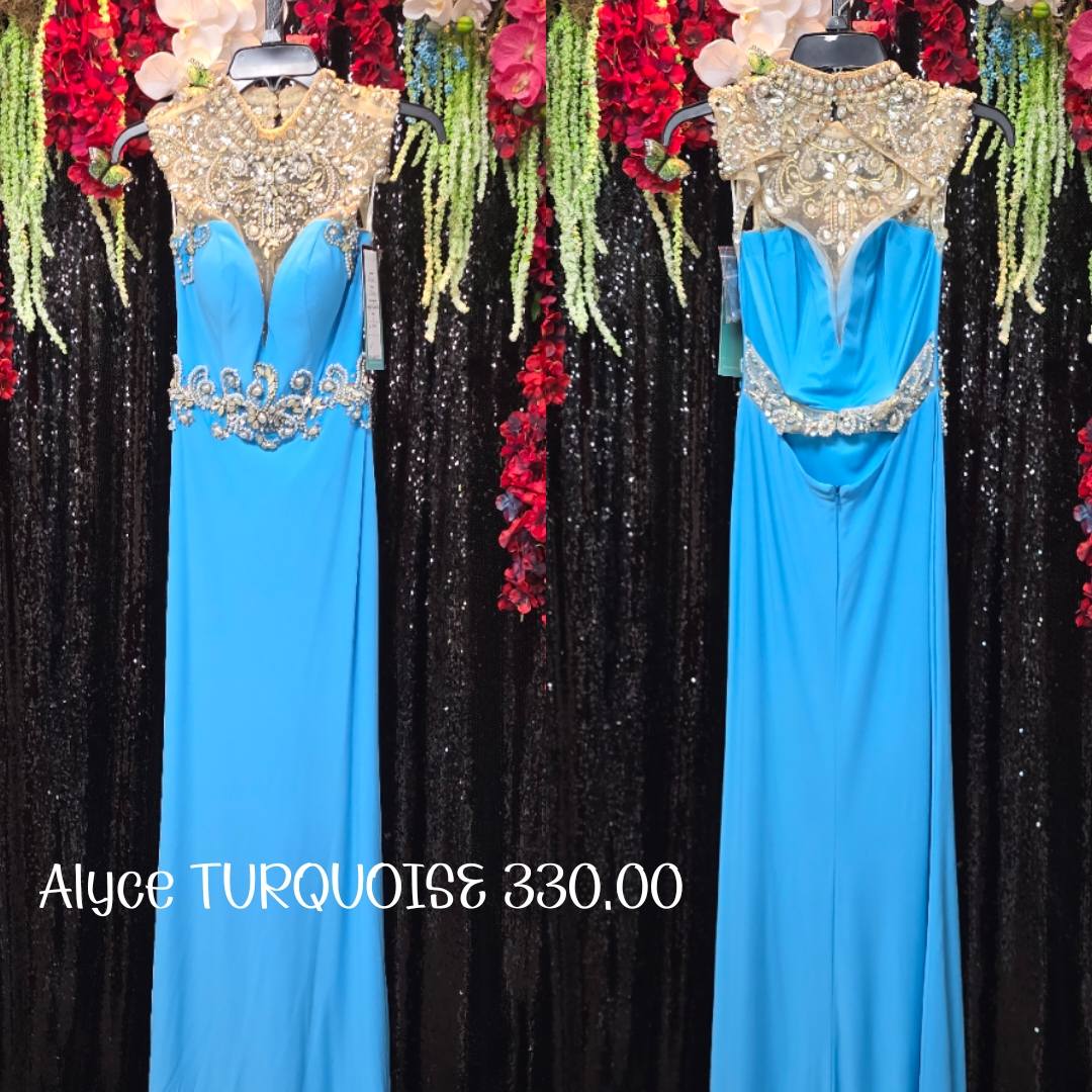 Striking turquoise evening gown featuring an ornate gold and silver beaded neckline, a cut-out chest detail, and an elegant drape. Ideal for making a memorable appearance at any formal event.