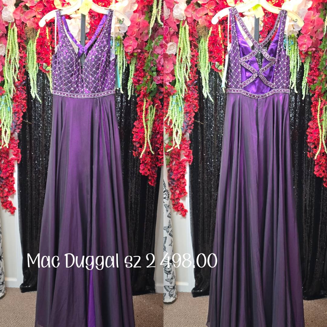 Stunning purple gown featuring a delicately beaded bodice and a lustrous skirt. Designed with a deep V-neckline and intricate lace-up details on the back.