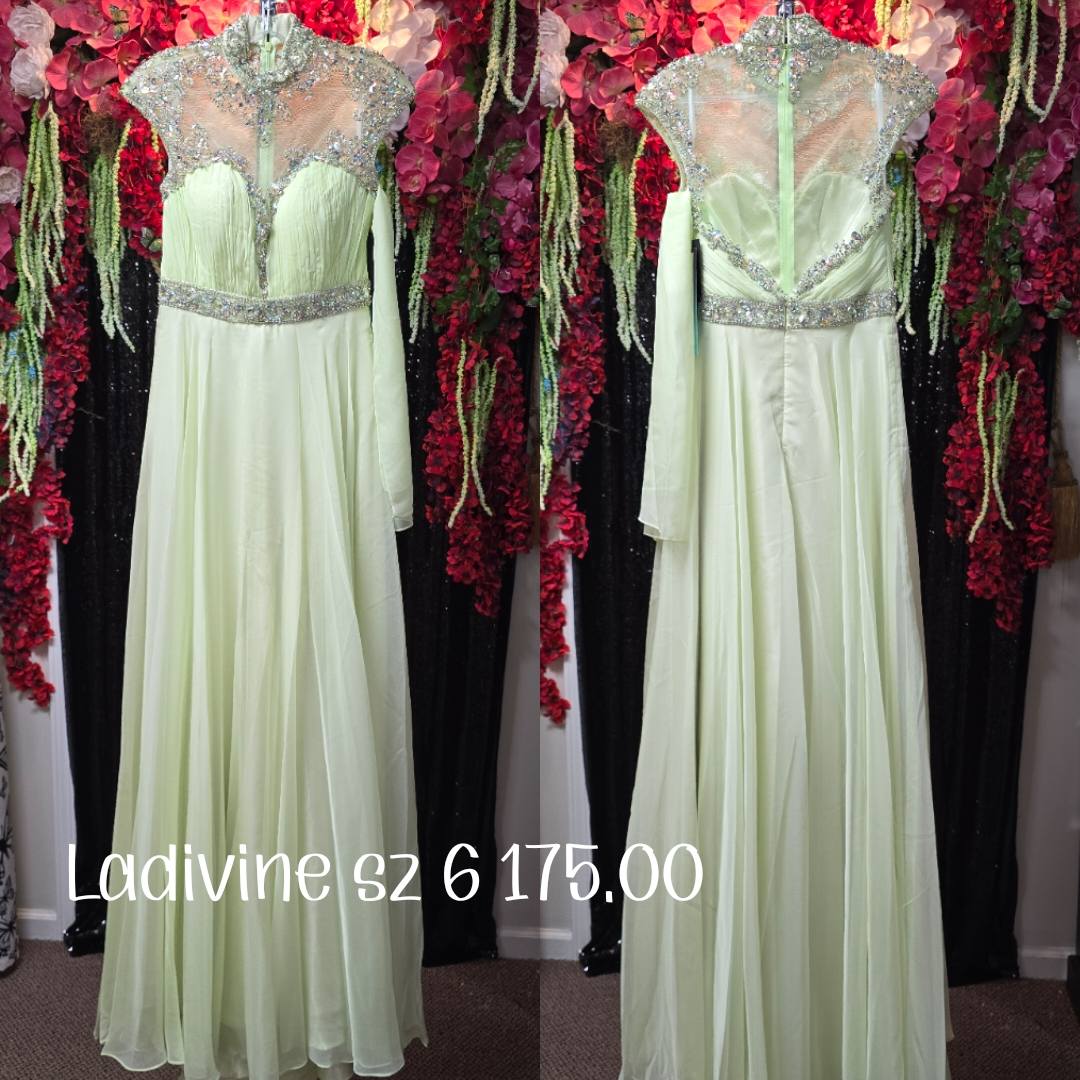 Charming light green gown with a sheer neckline and intricately embellished belt. Features long, flowing sleeves and a soft, airy skirt for a regal appearance.