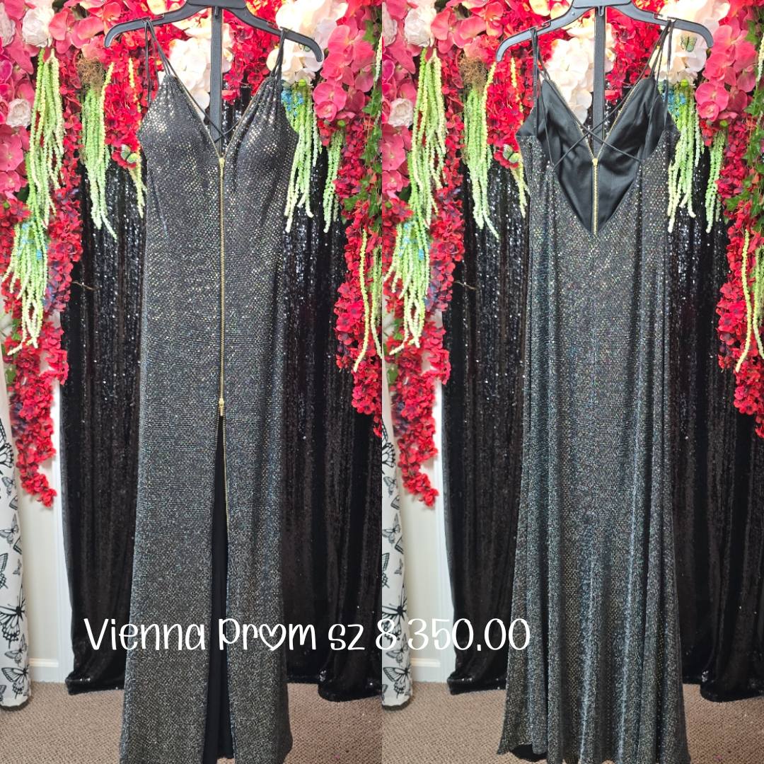 This shimmering black gown features full-length, sequined fabric with a sleek silhouette and a V-neck cut for a dramatic touch. Perfect for standing out at any formal gathering.