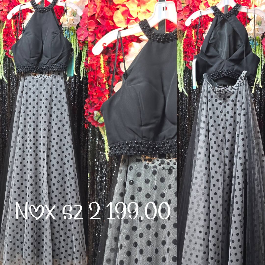 Chic and playful, this gown showcases a halter neck top with a detailed beaded waistline and a flowing polka dot skirt.