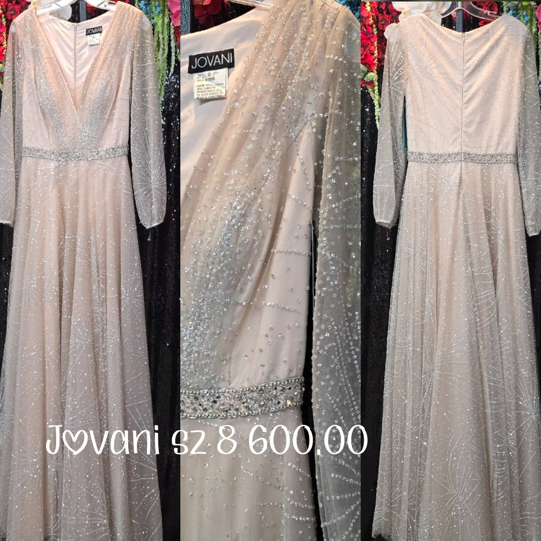 Stunning long-sleeve gown adorned with glitter and sequin accents, featuring a V-neckline and a cinched waistband with embellished detailing. Perfect for adding a touch of glamour.