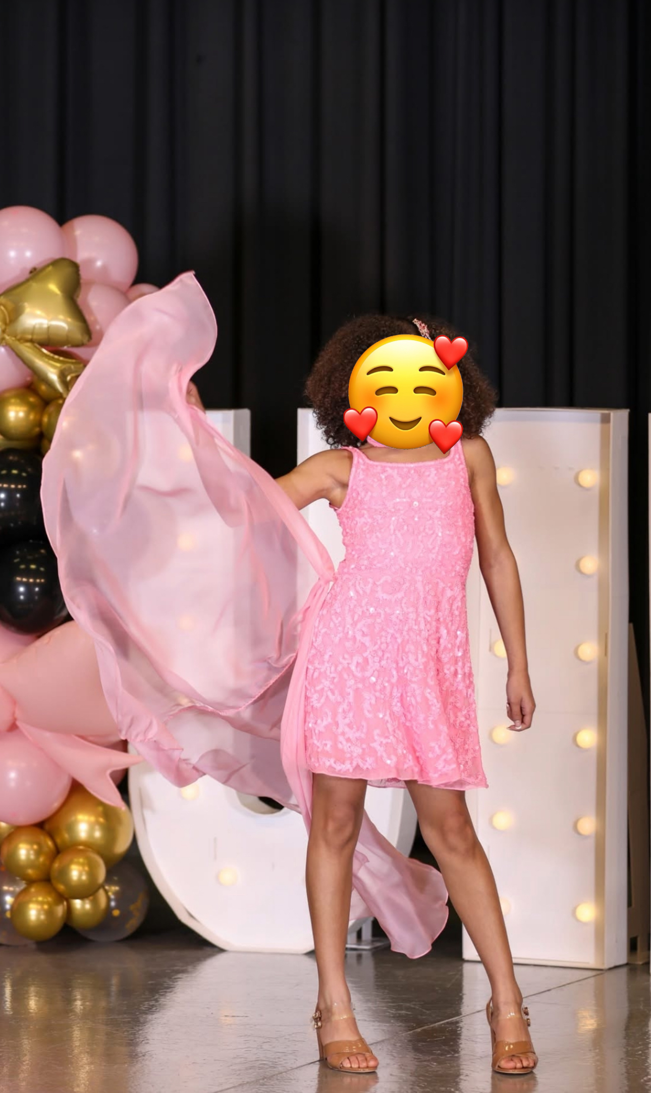 Charming pink lace dress, knee-length, highlighting playful patterns, complemented by a delicate sheer cape that adds a touch of whimsy.