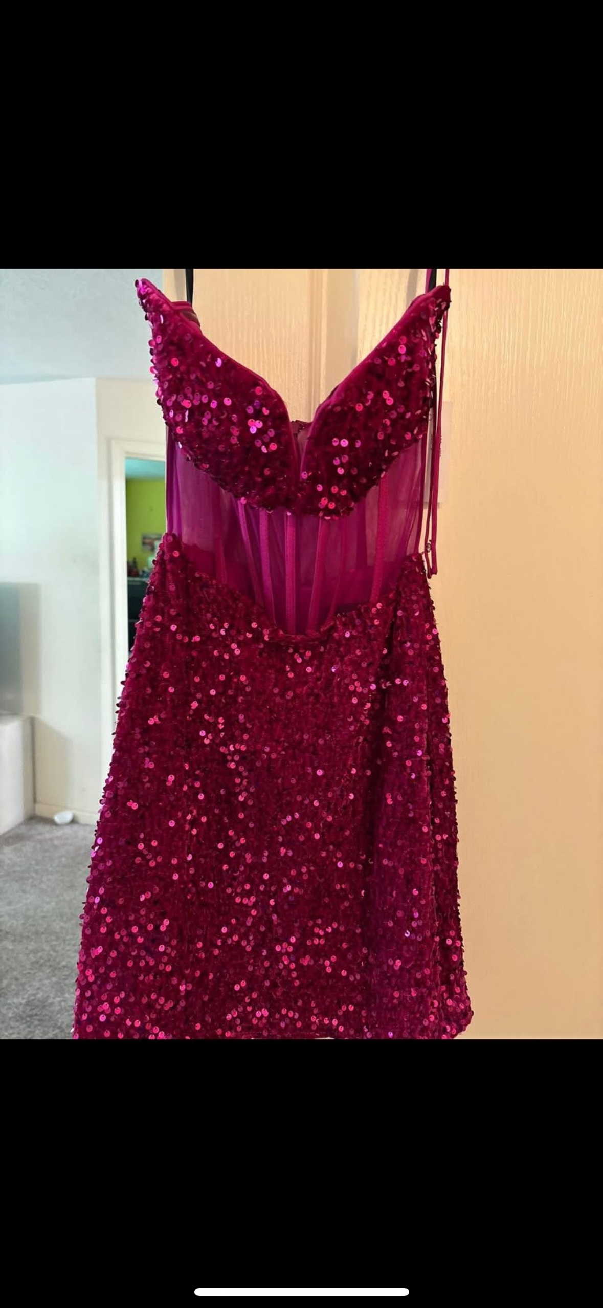 Vibrant fuchsia dress adorned with sparkling sequins. Features a pleated bust and detailing on spaghetti straps, ideal for a standout look.