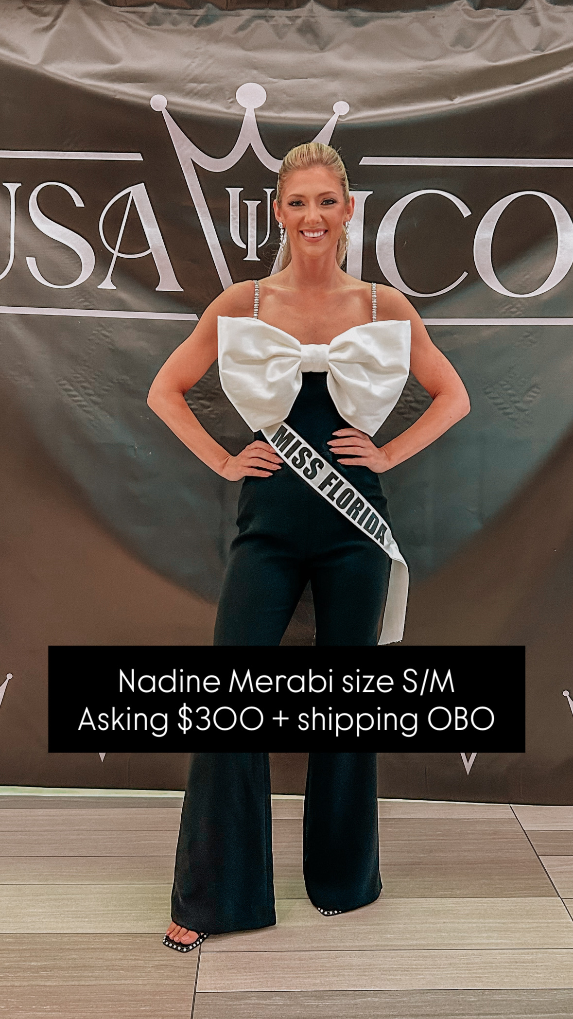 Stylish black jumpsuit, size S/M by Nadine Merabi, accented with a large white bow for a chic contrast. Ideal for making a statement at any upscale event.
