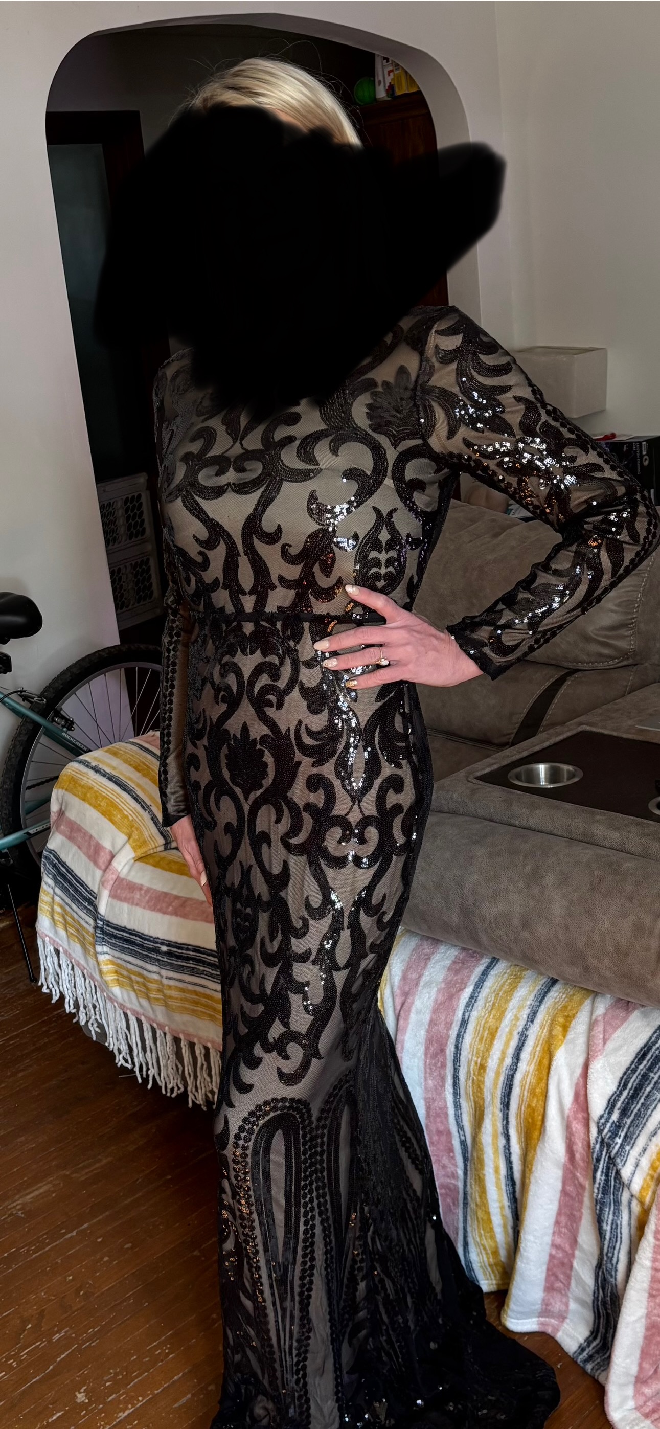 Striking floor-length gown adorned with black sequin embroidery over a translucent fabric, perfect for standing out at any formal gathering.