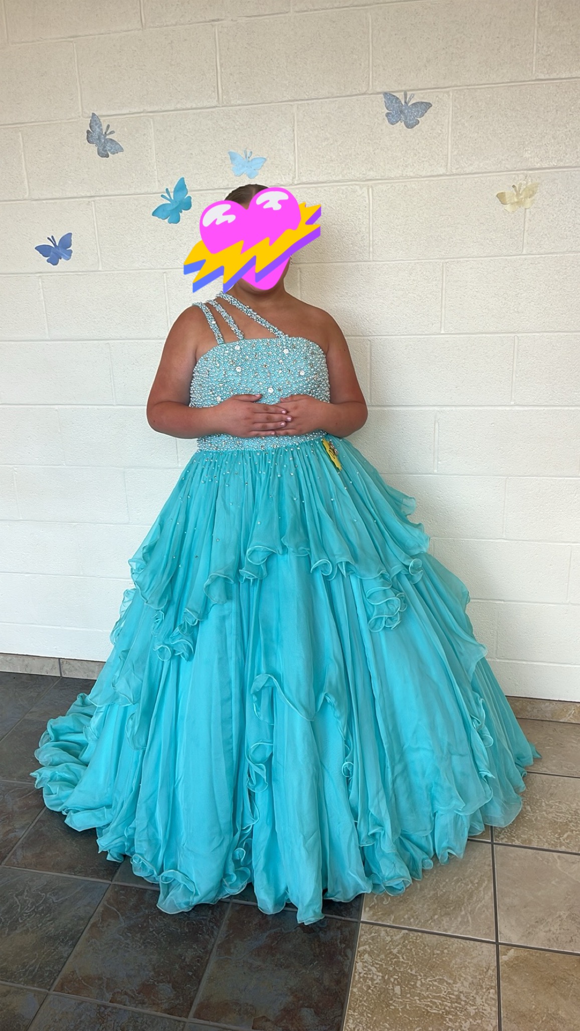 This statement piece features stunning beadwork on the bodice and a voluminous, layered skirt in a vivid aqua shade. Buyer pays shipping.