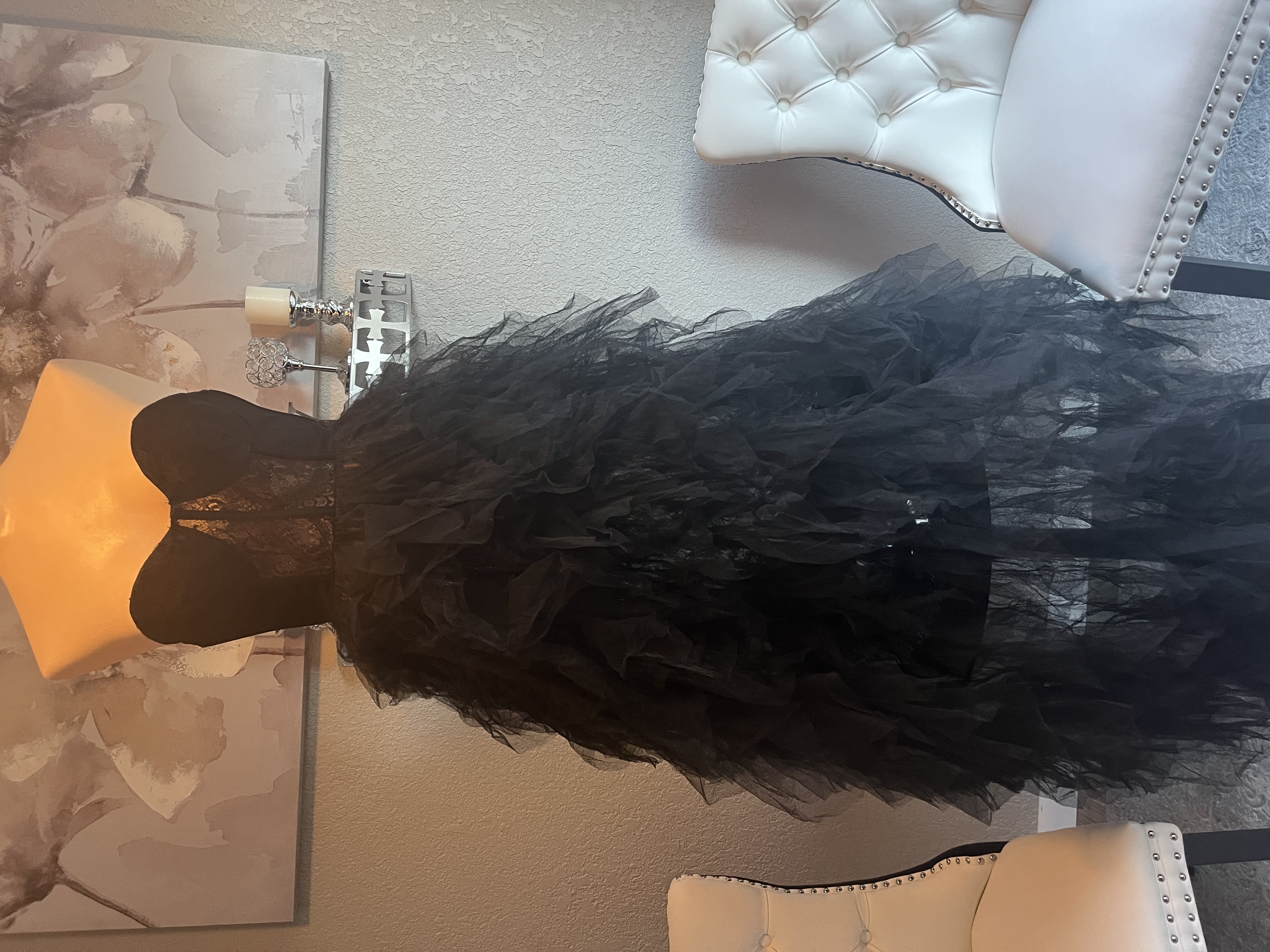 A dramatic tiered ruffle gown featuring a sheer lace bodice and a voluminous silhouette. Perfect for making a stylish statement.