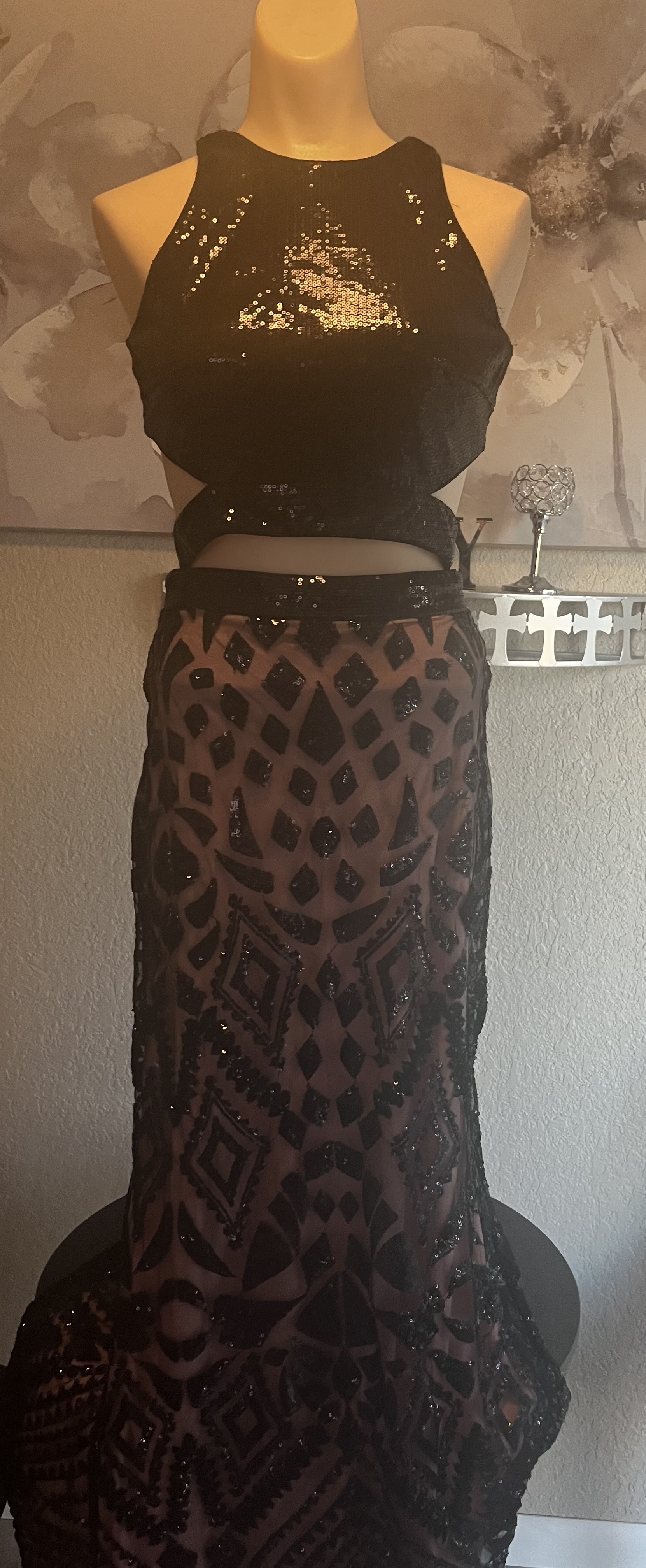 This stunning floor-length gown features intricate beadwork and sequin details. The bodice has a halter neckline. Great choice for distinctive formal wear.