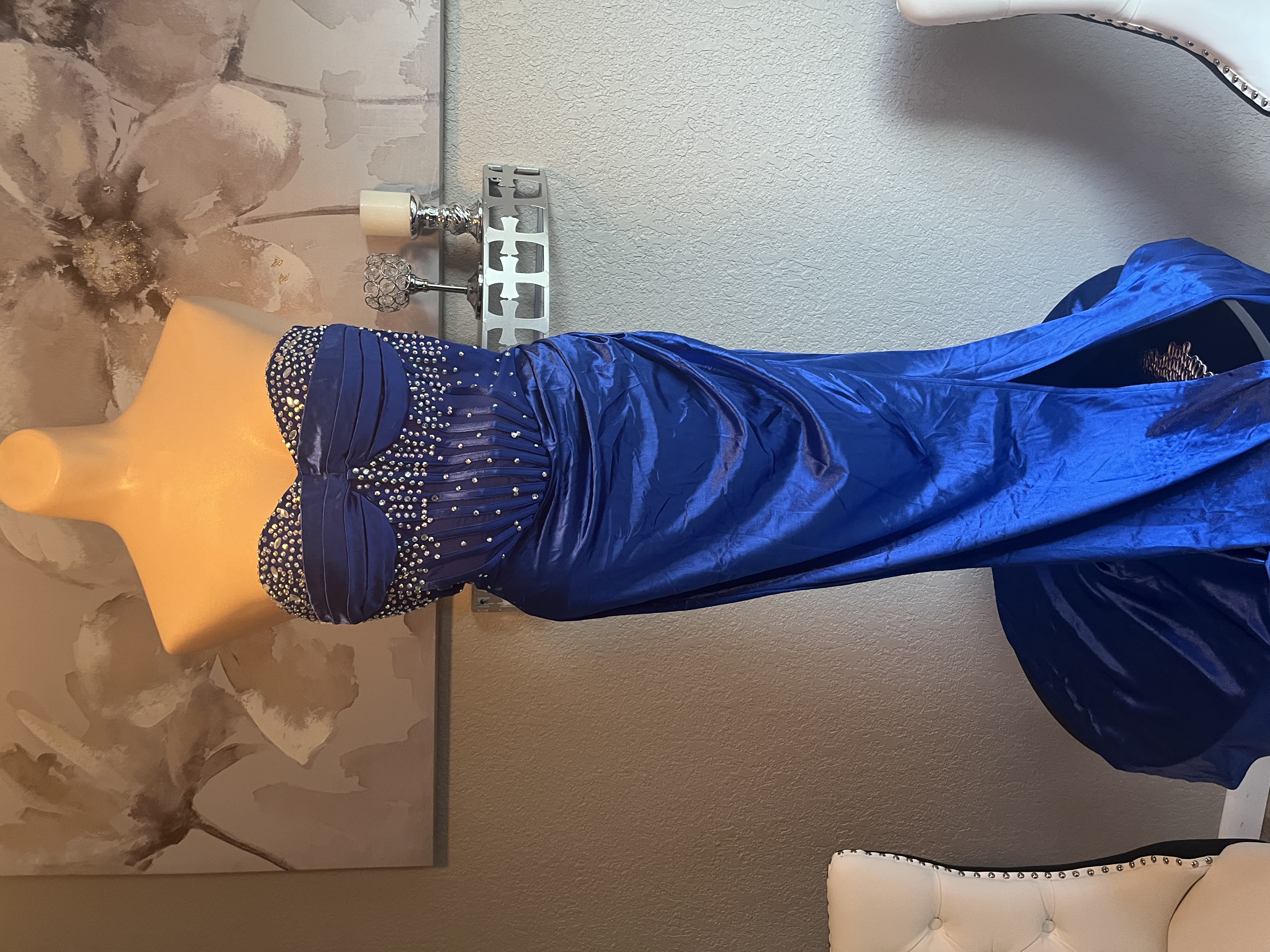 This satin blue gown features a captivating beaded bodice and a gracefully draped skirt. Perfect for adding a touch of glamour to any wardrobe.