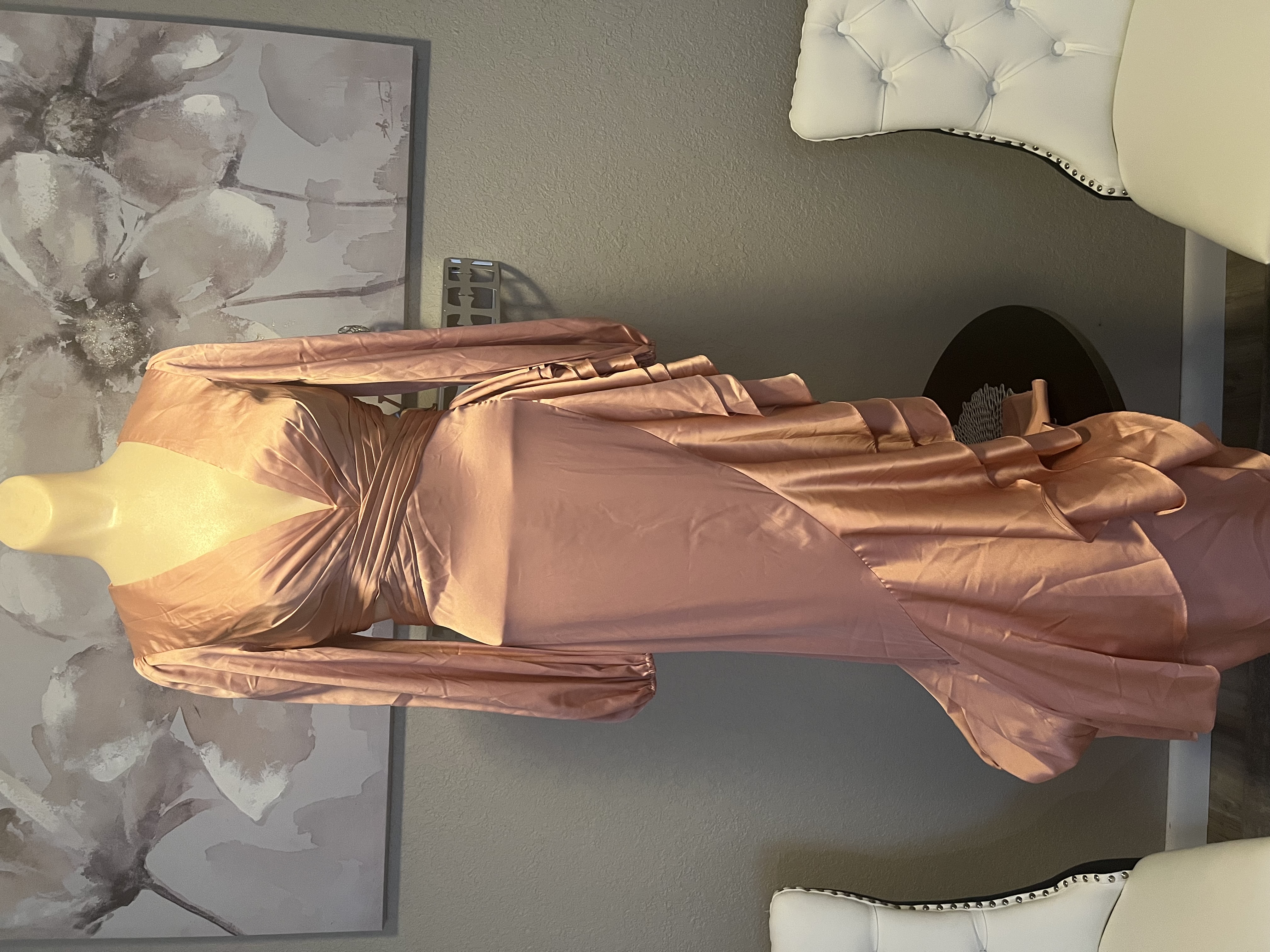 Stunning long-sleeve evening gown featuring a ruched front with a flattering deep V-neckline and cascading ruffles along the skirt. Ideal for special occasions.