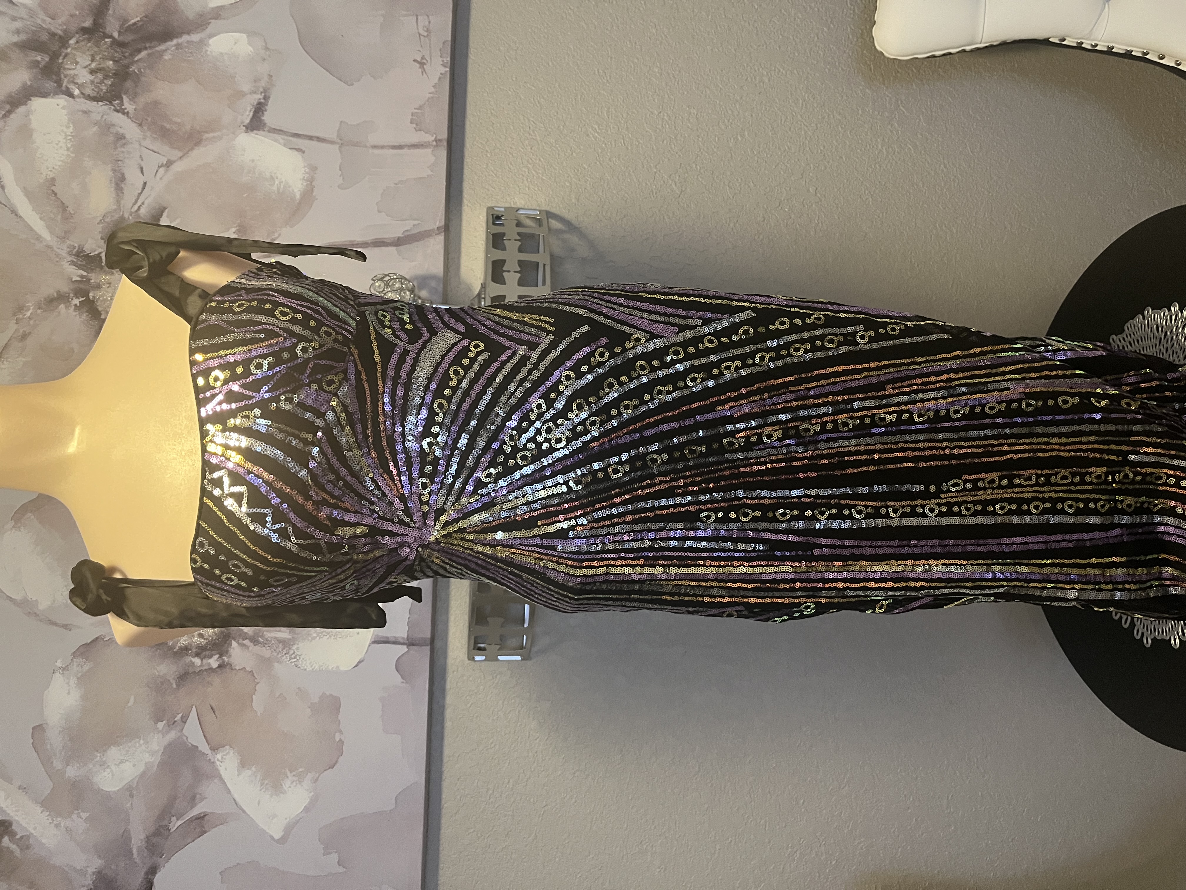 This eye-catching dress features a radiant display of multicolored sequins that glisten as you move. Fitted with charming bow-tie shoulder straps, it accentuates curves gracefully.