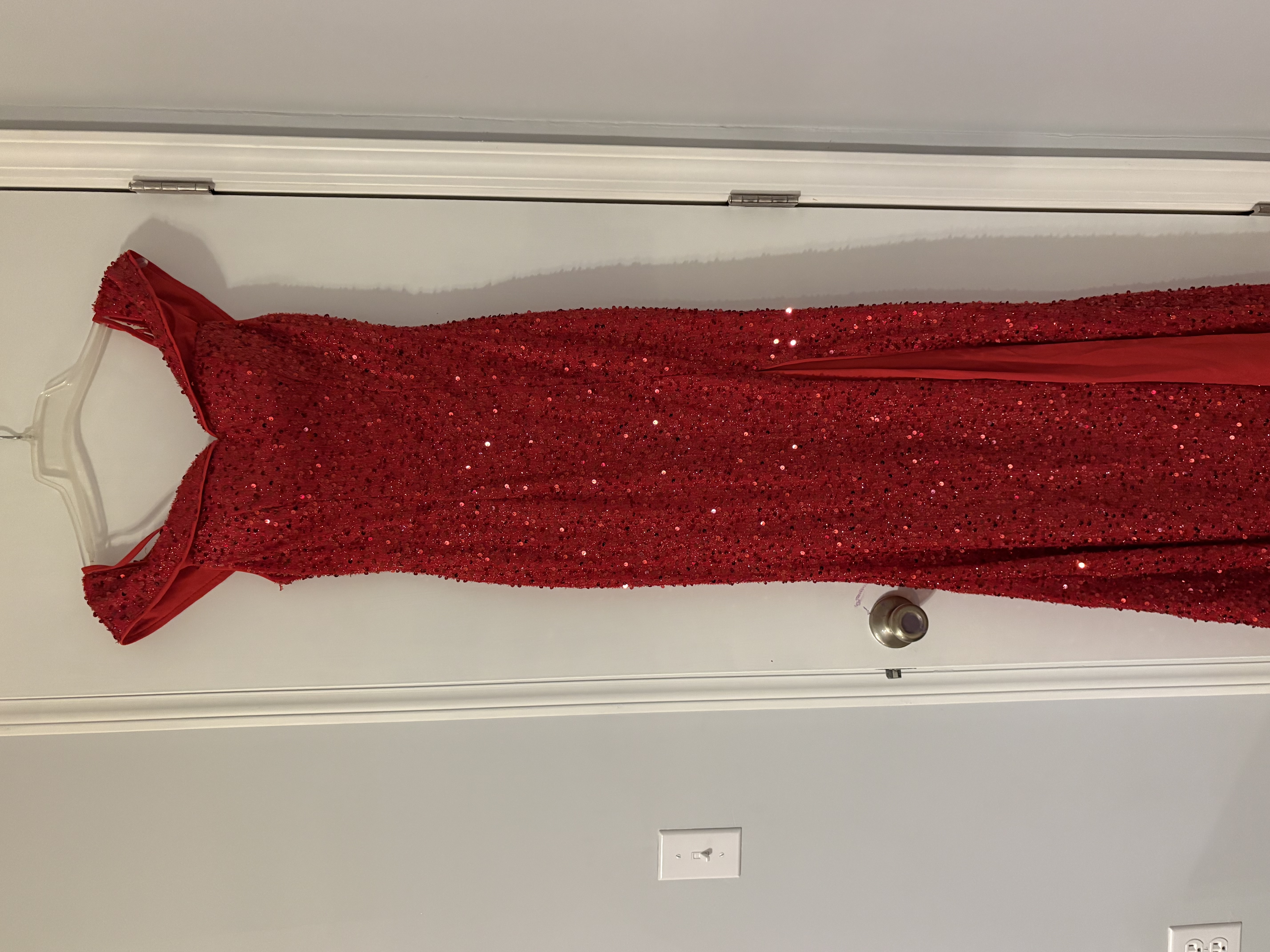 Stunning red gown adorned with sequins throughout, featuring an off-the-shoulder design with delicate shoulder straps. Perfect for making a shimmering statement.