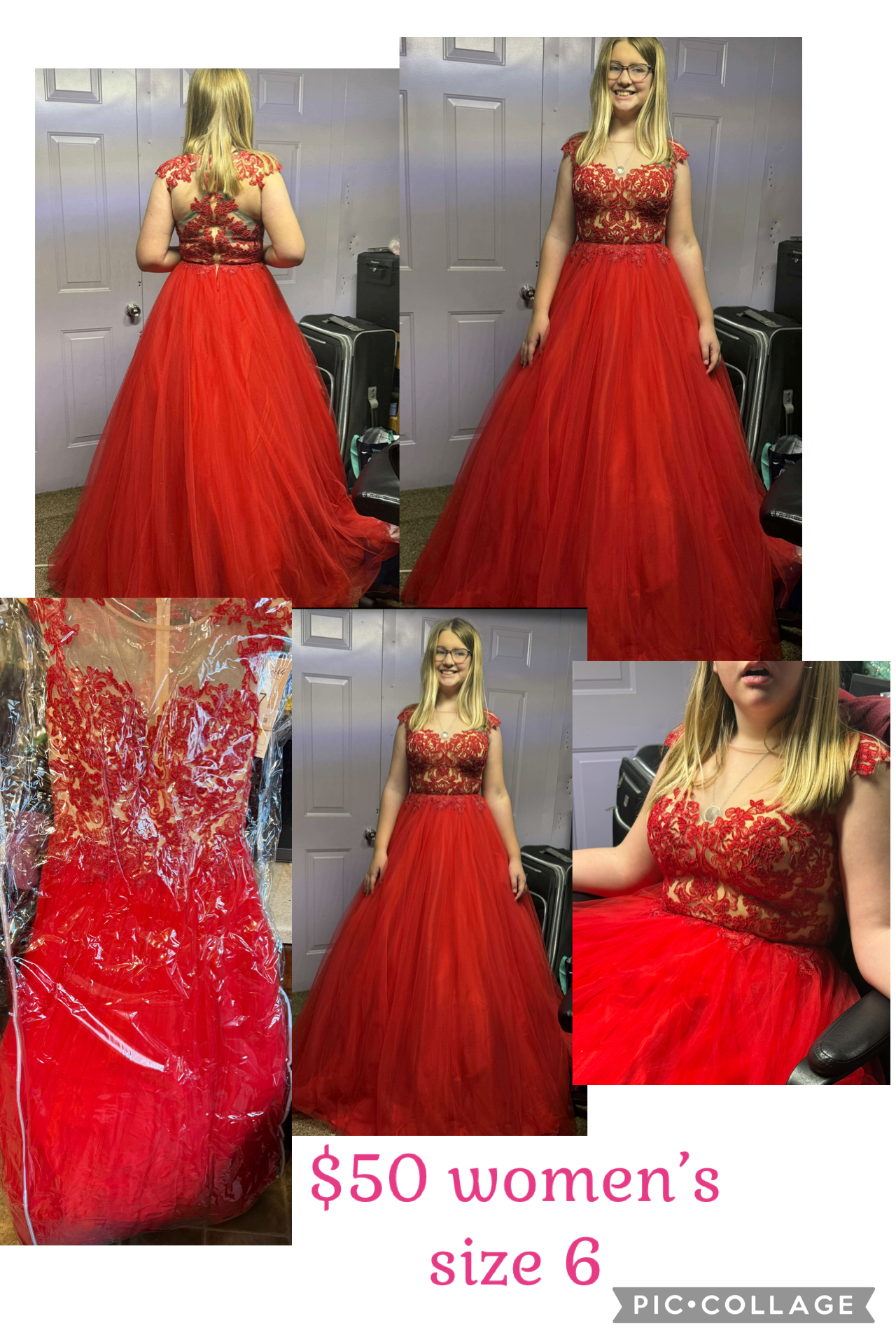 Striking red evening gown featuring a rich floral embroidery on the bodice and a voluminous tulle skirt. Perfect condition and ready for a stunning entrance.