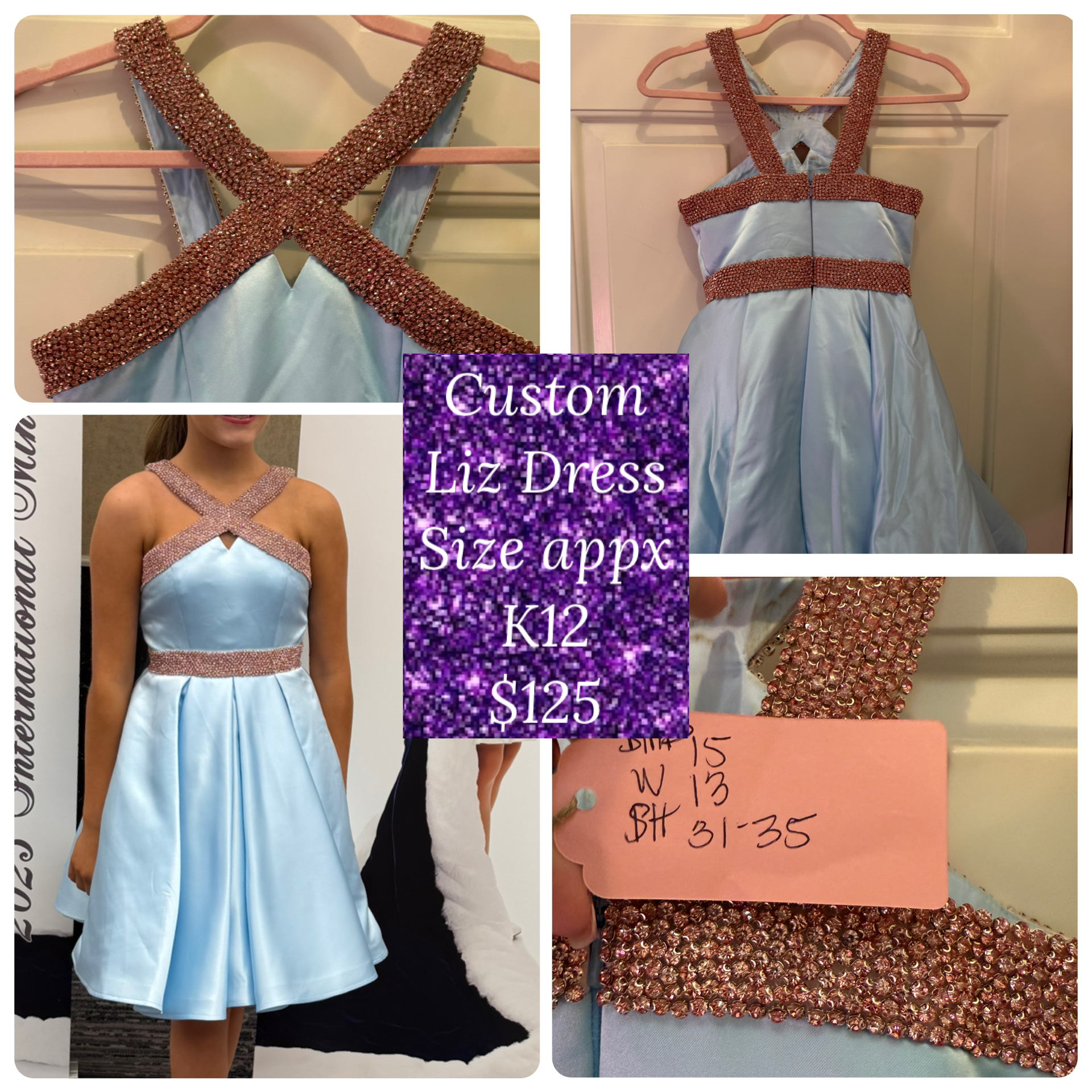 Chic sleeveless dress in light blue with a shimmering rose gold band and criss-cross detail. Ideal for a fresh and noticeable look at your next event.