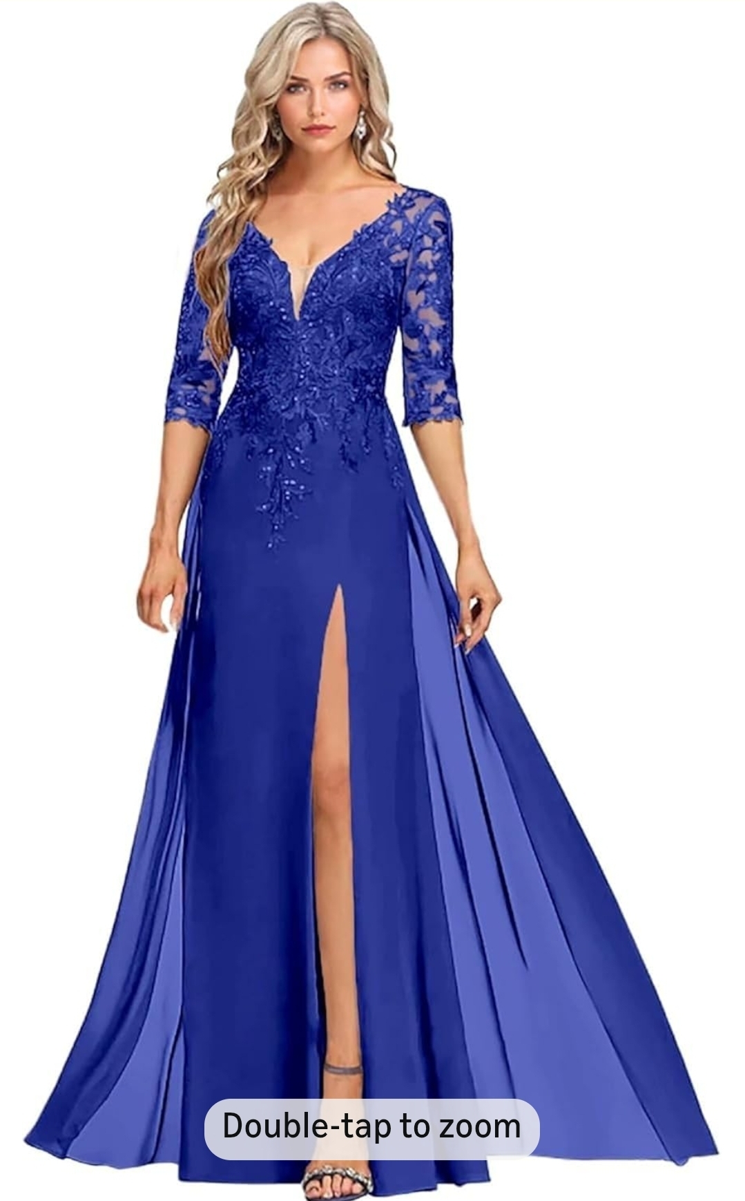Stunning royal blue gown featuring lace sleeves, a plunging neckline, and a daring slit. Perfect for adding a pop of color to your wardrobe.